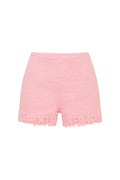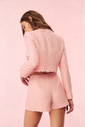 Pretty in pink in the Coralyn Short. These flirty bottoms arrive with an expertly tailored tweed fabric featuring custom ditsy floral guipure lace at the hem. With a slim and fitted silhouette, these shorts are finished with a side seam zipper for functionality. Pair with the Leilana Jacket for the full set.