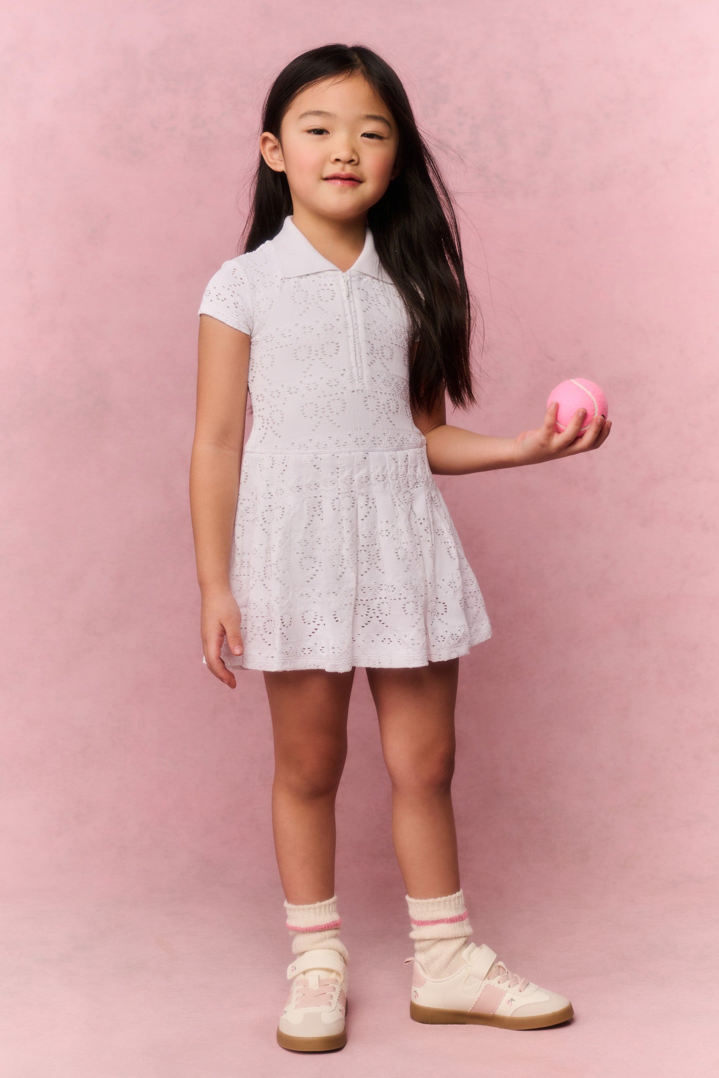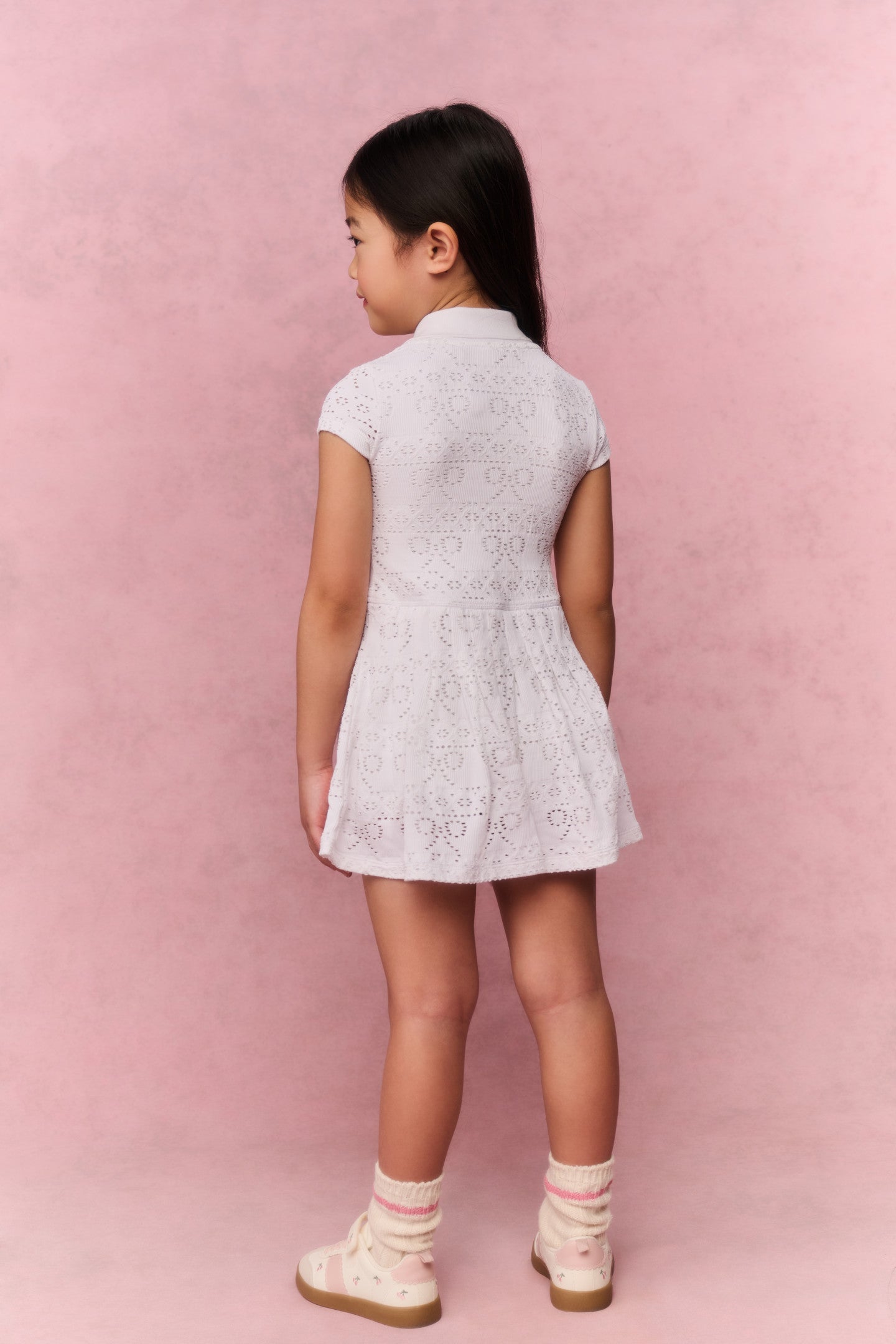 Little ones will love twirling in the Courtley Dress. This sweet skater mini features a charming all-over pointelle bow pattern with a fitted bodice and playful flared skirt. Designed with a darling point collar and short sleeves. The lightweight woven fabric has just the right amount of stretch for all-day comfort and effortless movement.