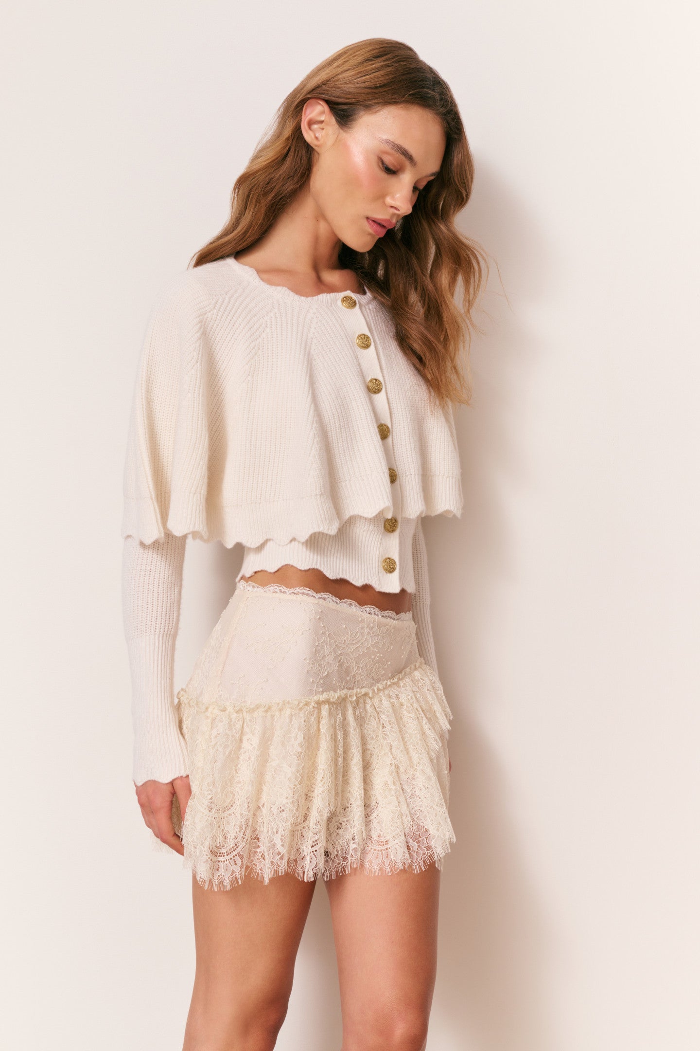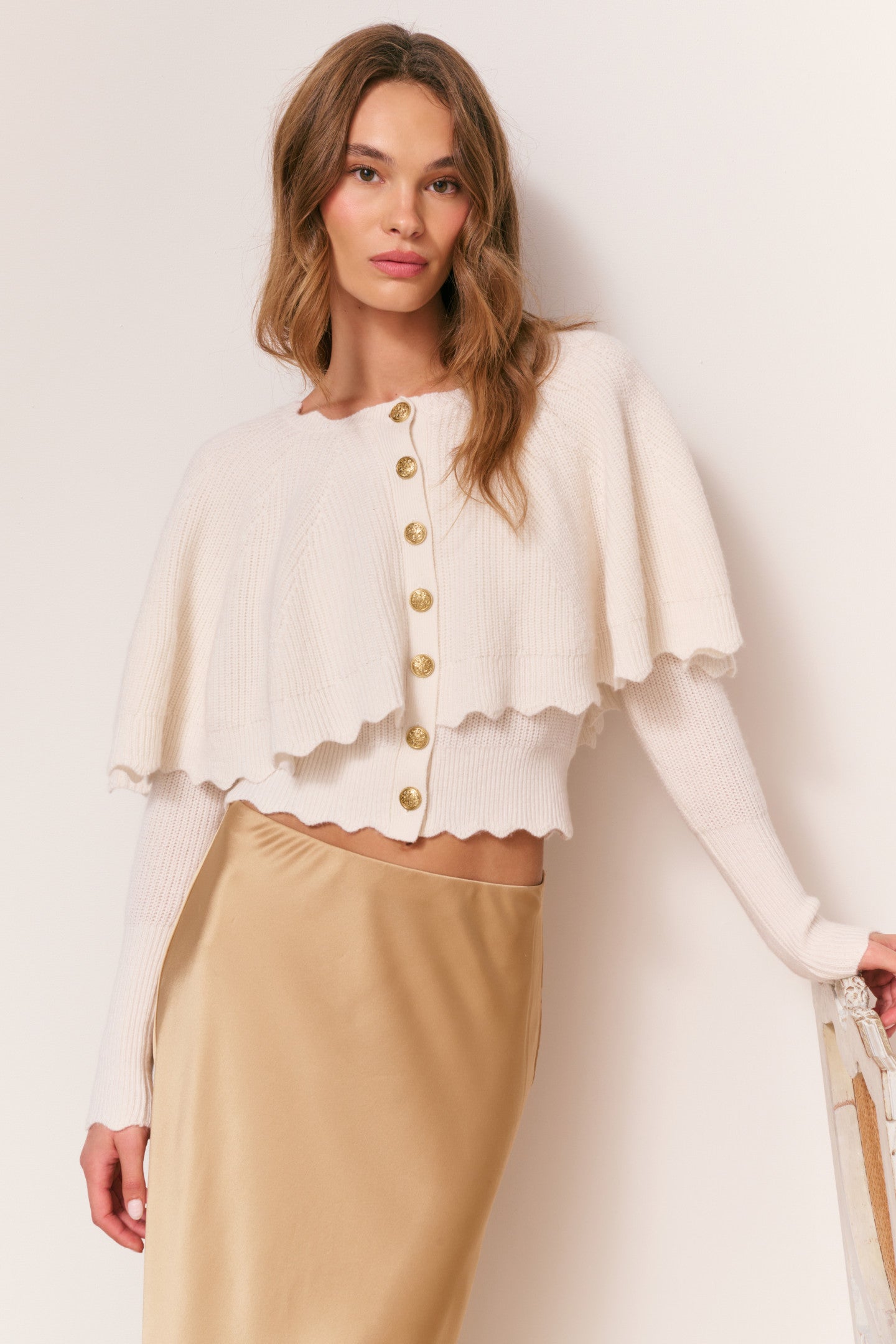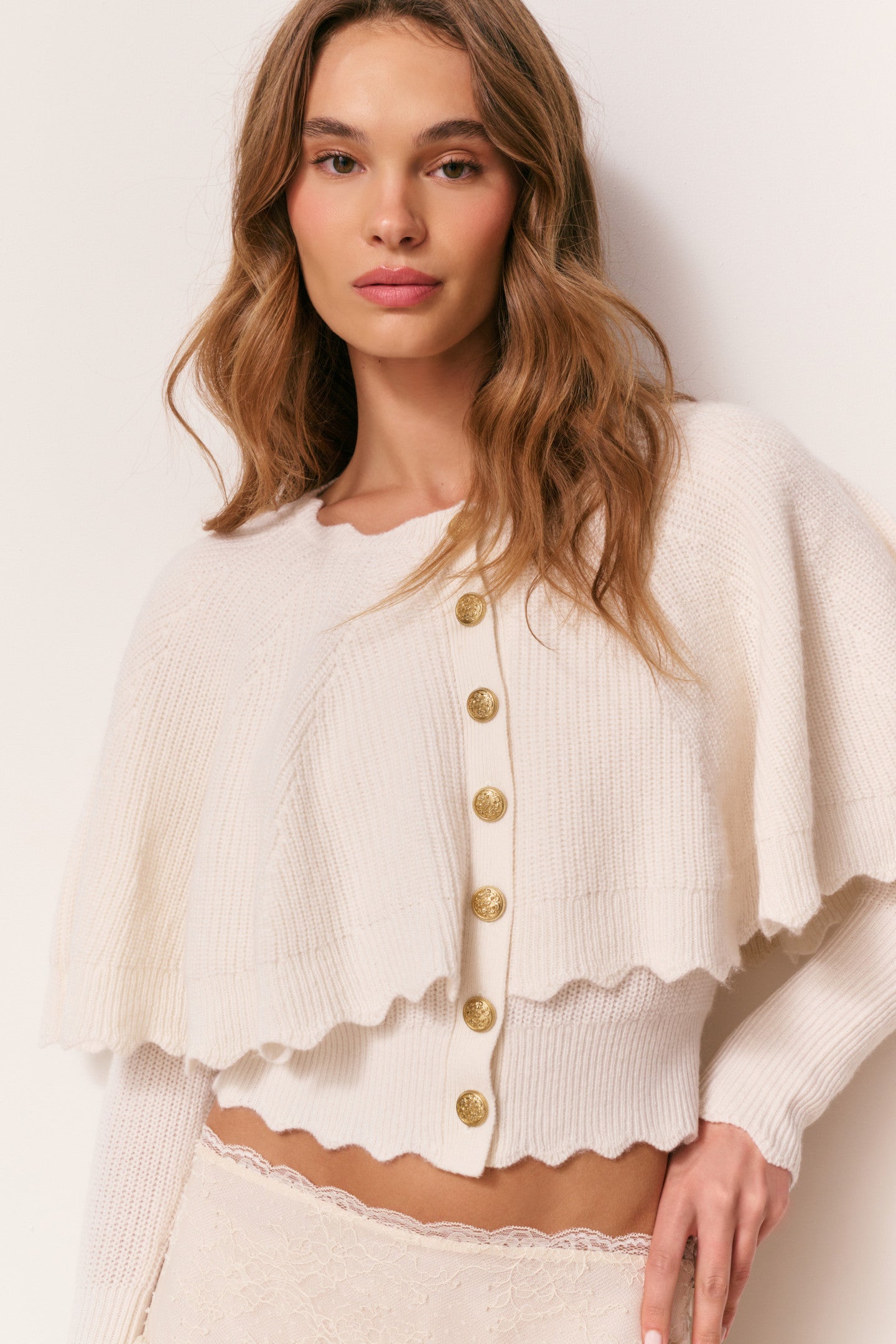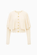 The Daelyn Cardigan is a whimsical, cozy layering piece, crafted in a soft blend of wool and cashmere. Designed with the same heart cable-inspired yarn throughout, this cute cardigan features a floaty attached cape, giving it a dreamy, capelet-like silhouette. Tall ribbed trim lines the cuffs, while scalloped ribbing edges the bottom hem, cape, and sleeve cuffs for delicate detailing. Custom gold military buttons add a refined touch, blending playful charm with timeless style.