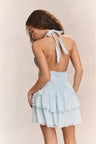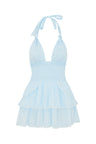 Our favorite Deanna Halter Dress returns for the season. This low-cut convertible halter ties in a generous bow at the neck and be crossed at front. Below a wide smocked waistband, the skirt flares to smaller details at the hips and two ruffled tiers.  Pair your mini dress with our heritage Avignon Crop Cardigan.