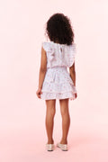 Meet our Decker Dress for girls in 100% cotton with custom lace. This easy frock has a ruffle-trimmed collar, buttons down center front, flutter sleeves, an elastic waist and overlapping asymmetrical ruffles at the skirt.
