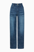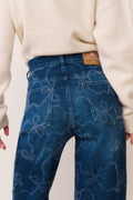 Our Dessa Jeans get a sparkling makeover. These medium-rise, wide-leg jeans are adorned with heat-fixed crystals in our signature winding bow motif, catching the light with every step. The soft hue and classic five-pocket construction blend whimsy and wearability.