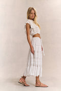 Our Donna Skirt sashays in with inset floral lace and lofty wildflower embroidery on custom dobby cotton. A functional drawcord at the waist can be tied in a bow at front or back. Below, the full sweep, midi-skirt drops into shirred panels and a final embroidered flounce at bottom.