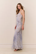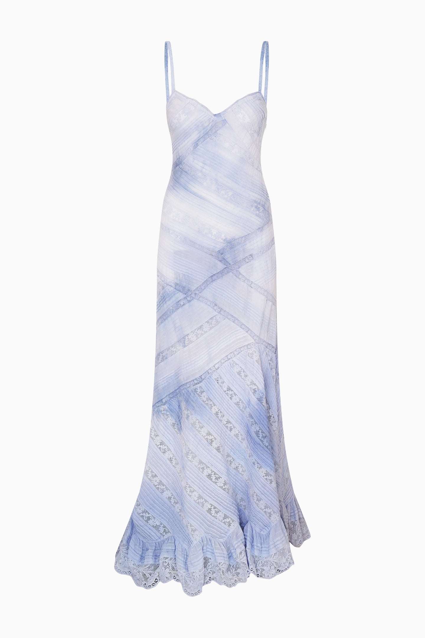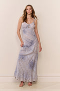 Designed with a sweetheart neckline and delicate spaghetti straps, the Eirene Slip Dress is an easy, feminine maxi with a softly fitted silhouette and flowing drape. A two-tone pattern, diagonal lace insets, and bias-cut panels add subtle movement, while a ruffled hem and lace trim finish the look with a romantic, boho feel.