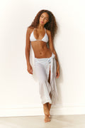 Introducing the Emabella Sarong. This pretty wrap cover-up stuns with a vibrant print and lace trims throughout and a self tie detail. Wear over your favorite swim.
