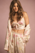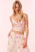 Living in the Emeraine Top. This charming top features an Italian-inspired print with hand-painted flowers in a romantic arrangement. With a scarf-inspired silhouette, the cami ties at the center front, has thin spaghetti straps and hits at the natural waist.