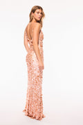 Introducing the Emmalisa Dress. This elevated evening dress stuns with large shimmering payettes all over giving it the ultimate summertime glow. The statement maxi features delicate spaghetti straps, a body-skimming silhouette, a sweeping skirt, and is finished with a zipper for closure.