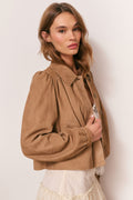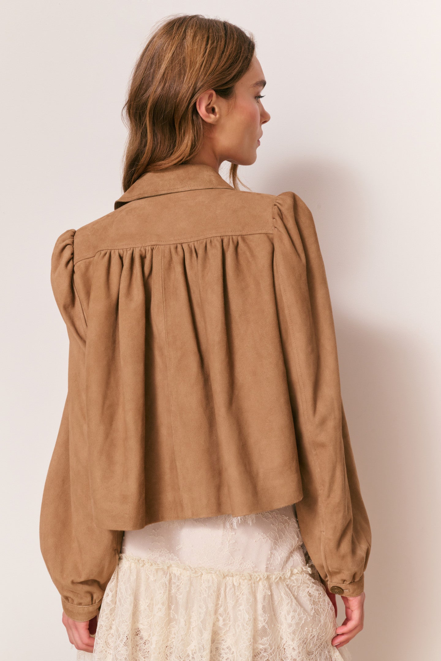 The Eris Jacket is a romantic, bohemian-inspired take on outerwear, crafted in soft, buttery lamb suede. This trapeze-shaped cropped jacket falls just below the natural waist, featuring a delicate collar, hidden front buttons, and convenient side pockets. Full-length blouson sleeves add volume and movement, creating a soft, effortless silhouette that pairs perfectly with skirts, dresses, or high-rise denim for a layered, dreamy look.