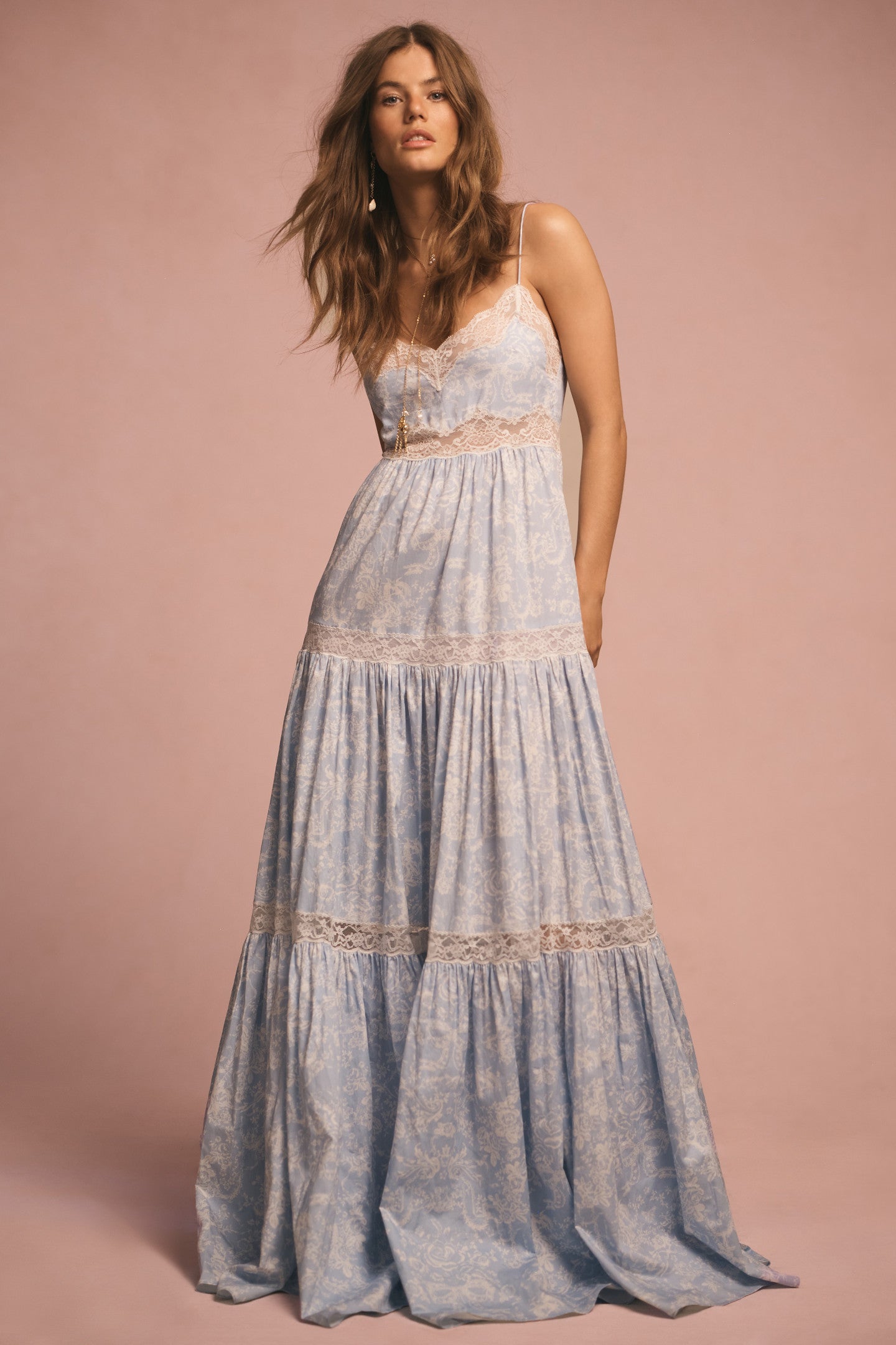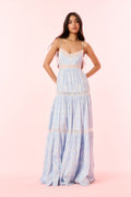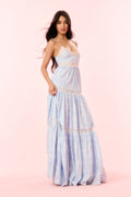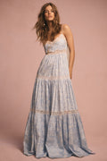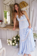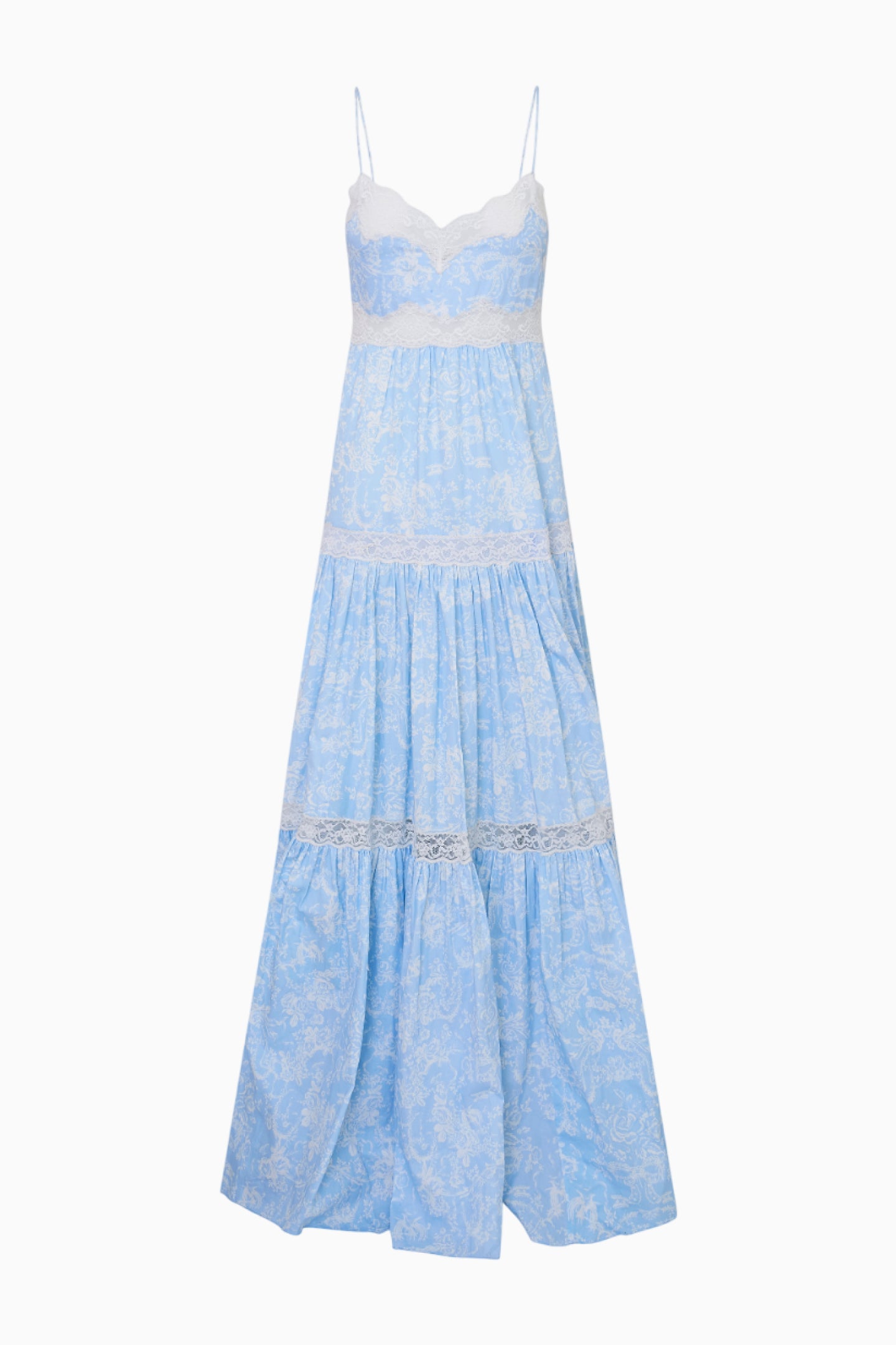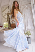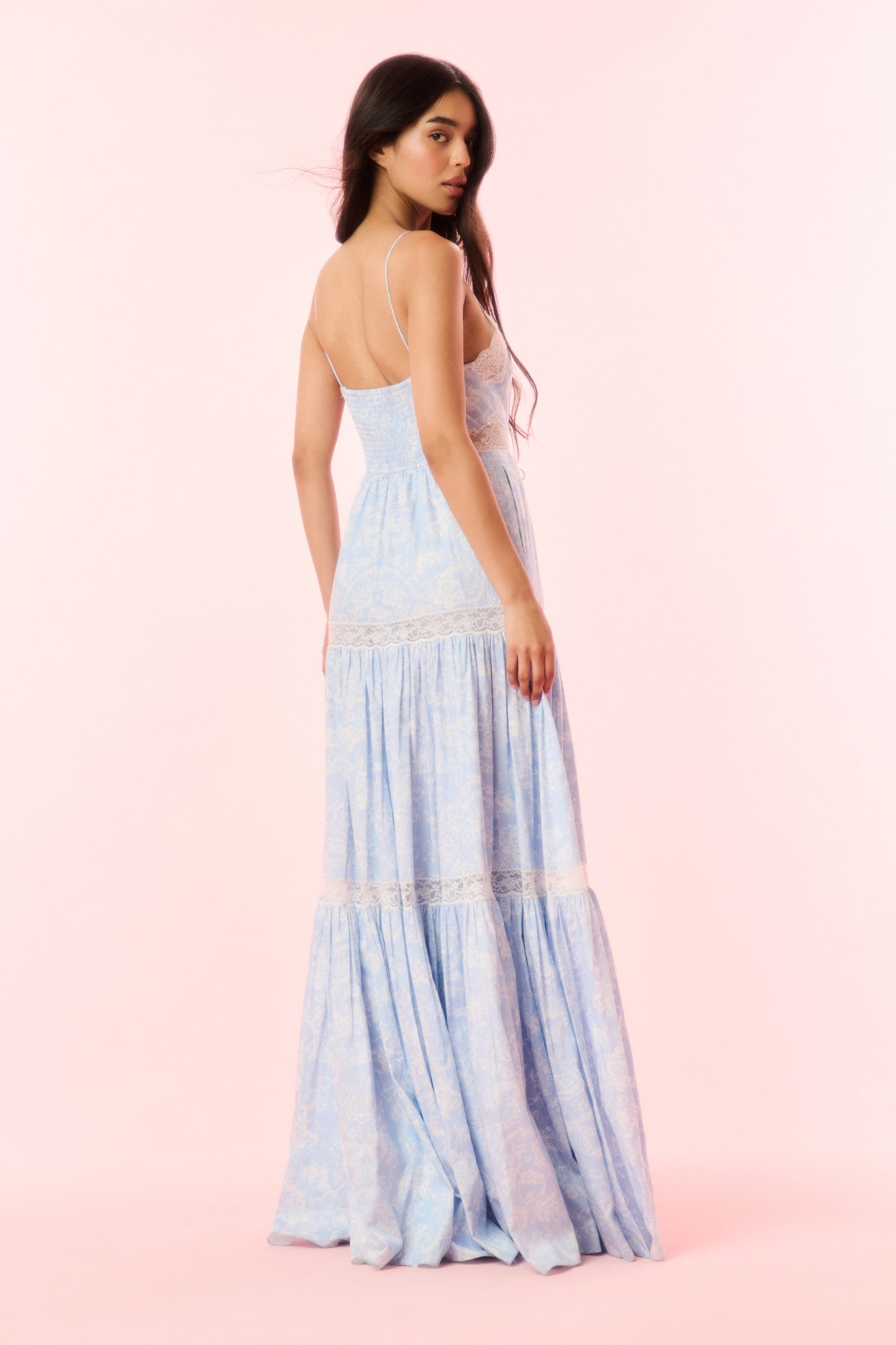 Introducing the Espa Dress. This pretty frock debuts with an Italian-inspired print on a crisp summer poplin fabric. The evening wear party gown arrives with smocking at the back for ease and comfort before falling to a multi-tiered skirt adorned with vintage-inspired lace. This maxi is complete with adjustable spaghetti straps.