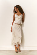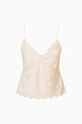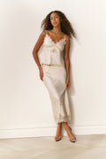A timeless cami with a vintage-inspired twist, the Evony Top arrives in our luxe, satin crepe fabric with a soft sheen, beautiful drape, and effortless wear. Cut on the bias for a slinky, body-skimming fit, she features a flattering V-neckline, empire waist seam, and scallop lace trims at the neckline, sweep, and waist. Easy to pull on and endlessly versatile, pair with the Vivia Skirt for the full set.