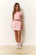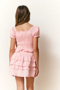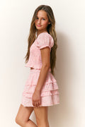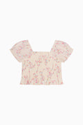 Our girls are so sweet in the Fabielle Top. This charming top is designed from a cotton voile fabric featuring our signature bow fleur print reimagined into tiny ditsy florals printed all over. With short sleeves, the bodice of the top is smocked for ease and comfort and the piece is finished with a slight peplum, ruffled hem.