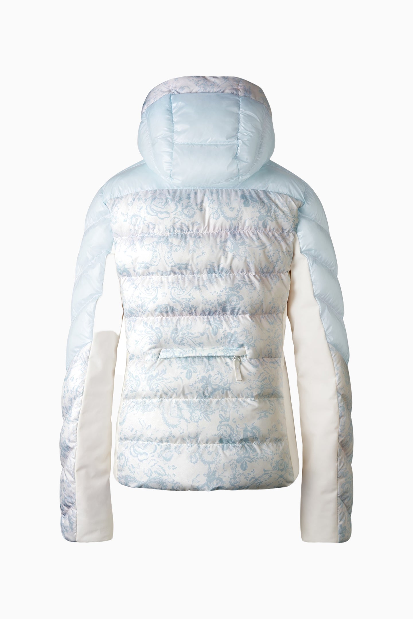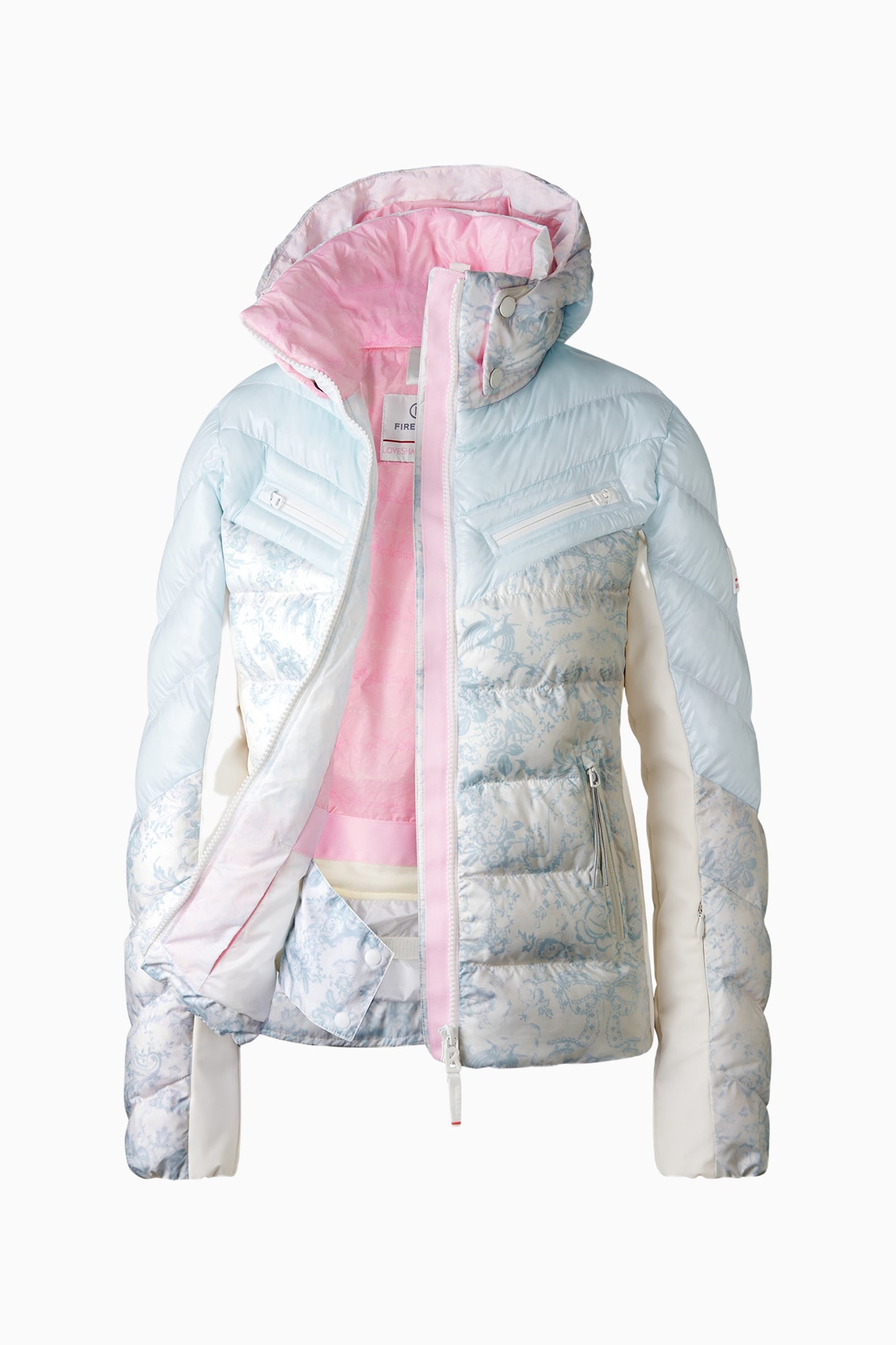 Introducing the Farina3 Jacket from our BOGNER FIRE+ICE x LoveShackFancy collaboration. The cold weather piece arrives in new, limited-edition whimsical prints and pastel hues. The design mix of shiny and matt nylon sections makes the Farina jacket a must for ski season. The detachable hood, thumb loops and internal snow guard ensure comfort. Various zip pockets round off this functional hem.