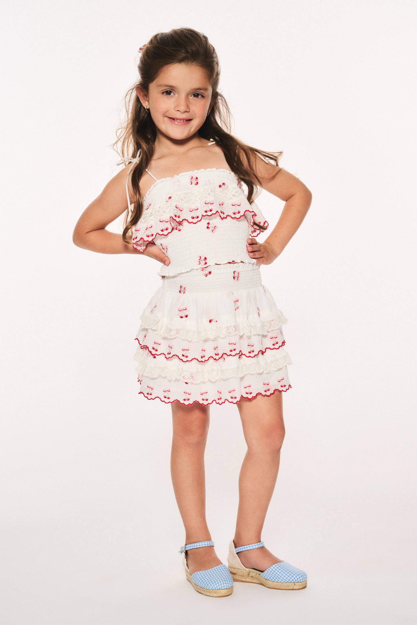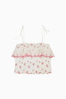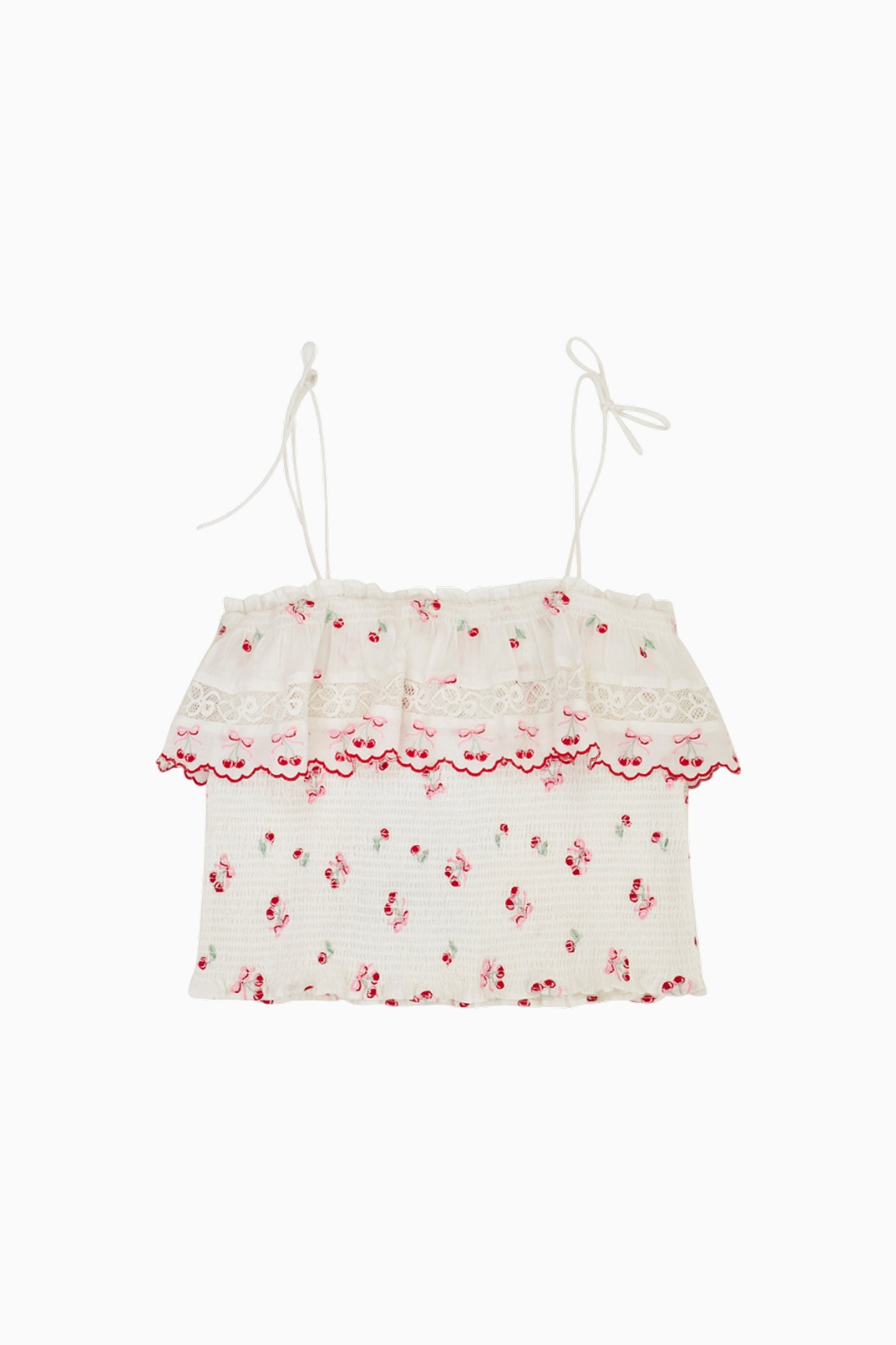 Introducing the Fatima Top as part of our America’s Sweetheart Cotton Collection. This pretty piece stuns with printed cherries all over, a ruffle on the top, and thin tied straps.