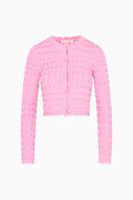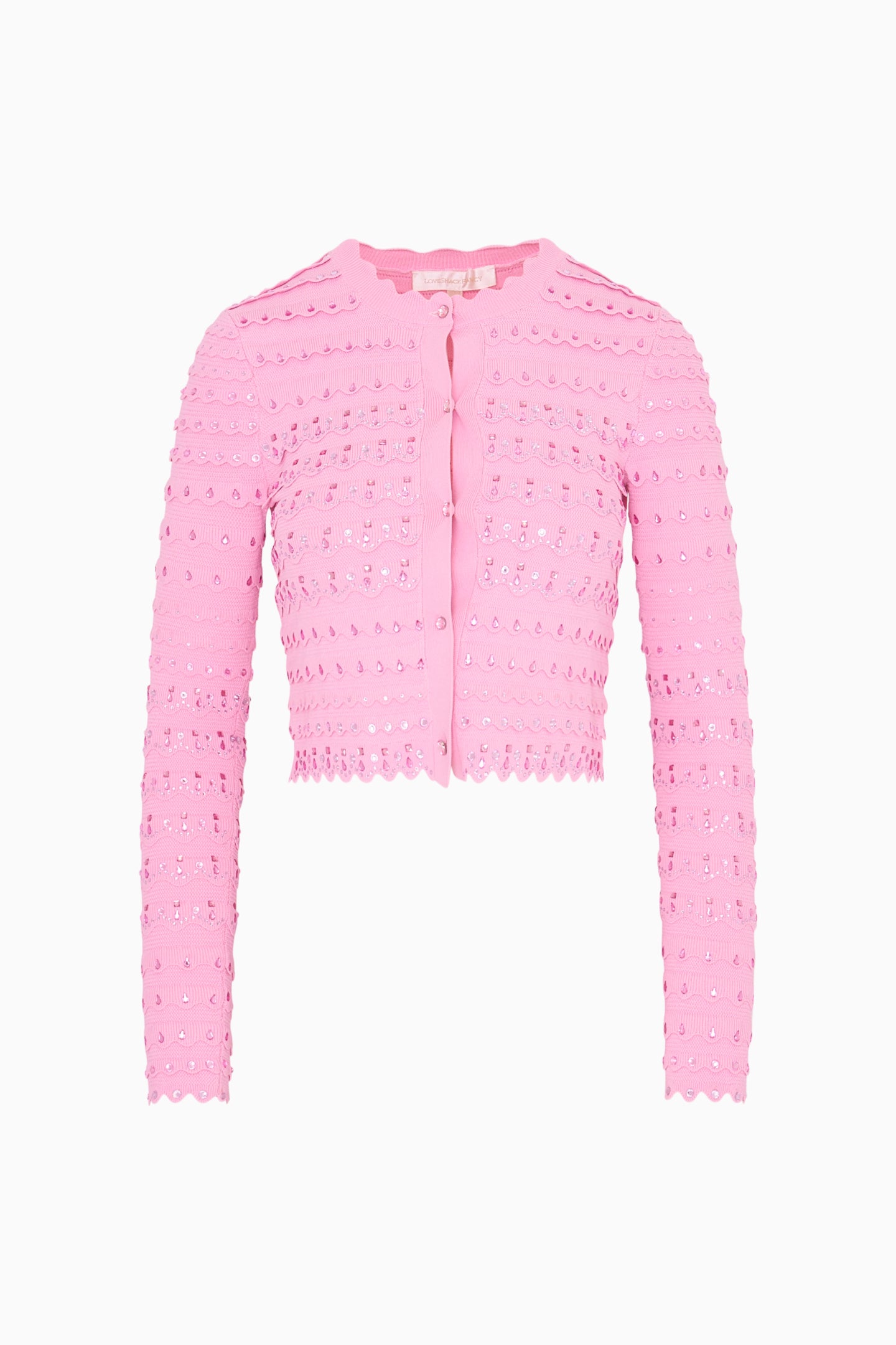 Elevate your look with the Ferris Cardigan, designed from a stretchy knit fabric for a sleek, compact silhouette with a refined hand feel. The cardigan features dimensional scallops throughout, each adorned with heat-fixed crystal embellishments in varying shapes for shimmering, eye-catching detail. A regular placket down the front is finished with clear crystal buttons, perfectly complementing the sparkle of the scallops.