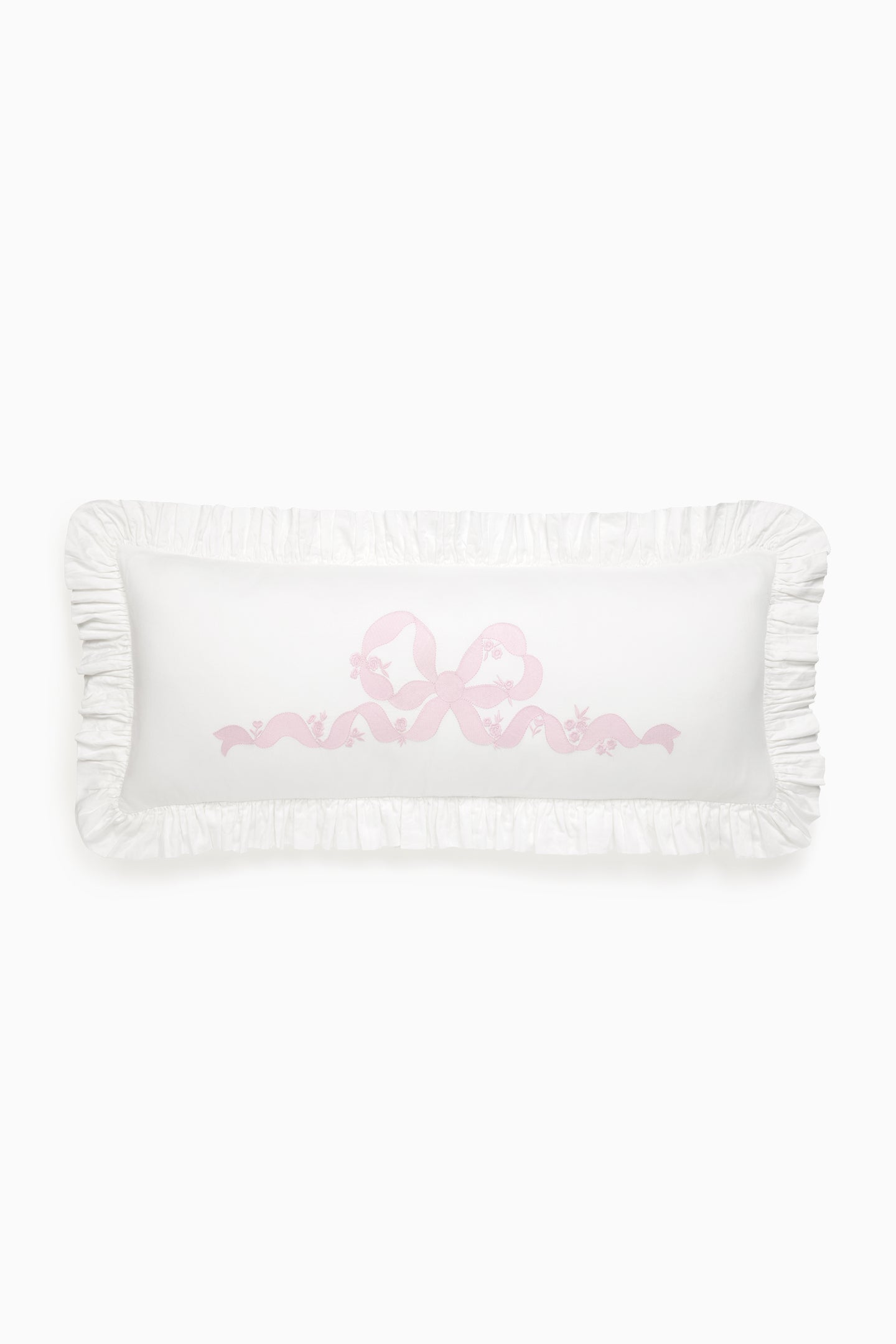 Loving on the Lumbar Pillow. The large, oversized pillow features our floral bow design with a double layer self and ruffle-adorned edges. Pair with our coordinating bedding for a matching moment.