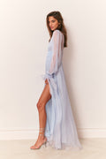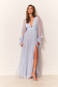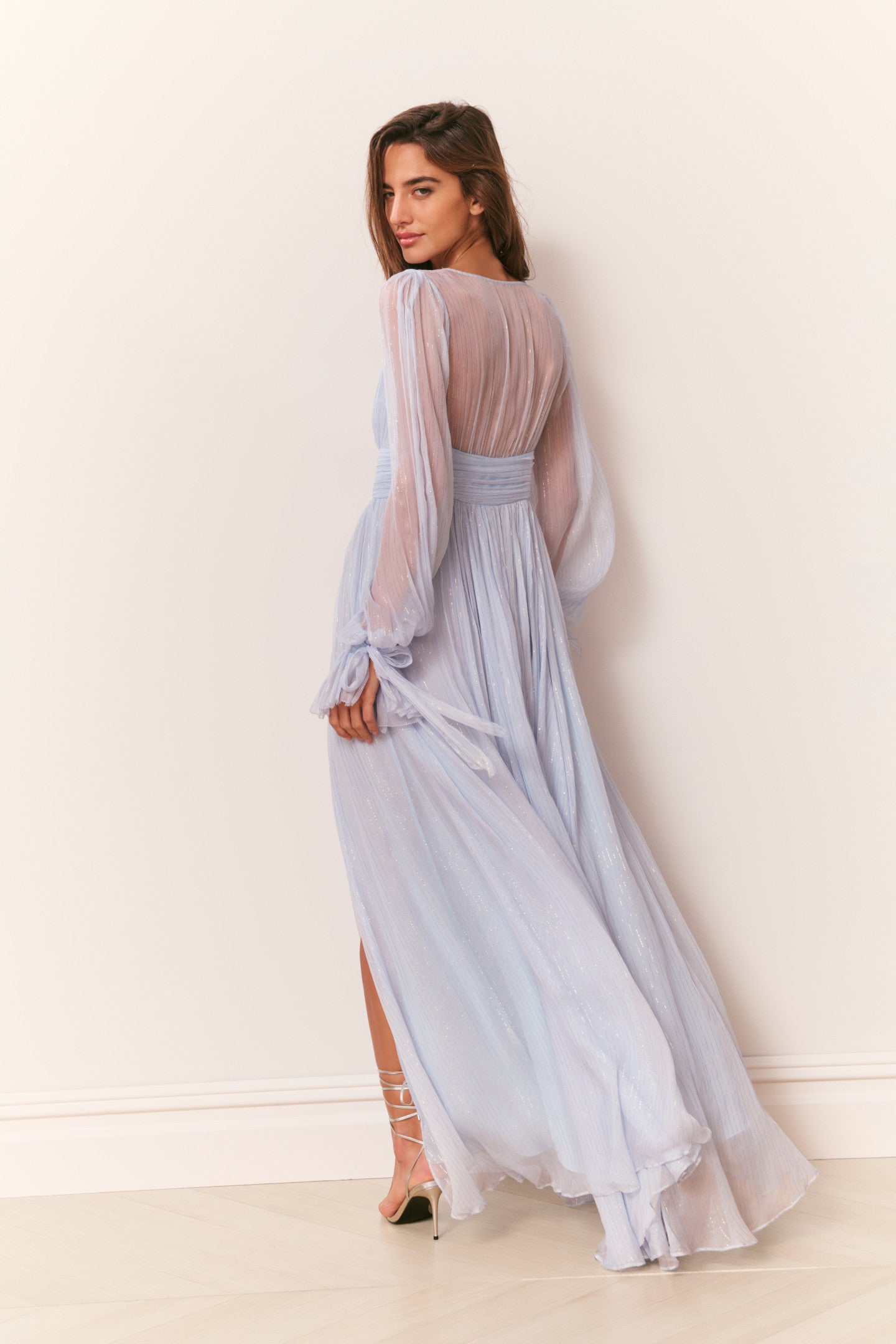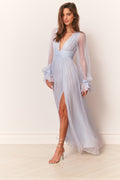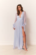 Make an entrance in the Galatea Dress, designed in our luminous dusk lurex chiffon — a luxe blend of silk and metallic that shimmers with every step. This true evening gown channels bohemian glamour with a plunging deep V-neckline, ruched waistband, and a shirred, sweepy skirt that moves effortlessly. Billowy blouson sleeves finish in tieable cuffs for a romantic touch, while a thigh-grazing slit on the wearer’s left adds a hint of flirtation. Fully lined through the body with sheer sleeves; finished with a concealed zipper at the back.