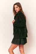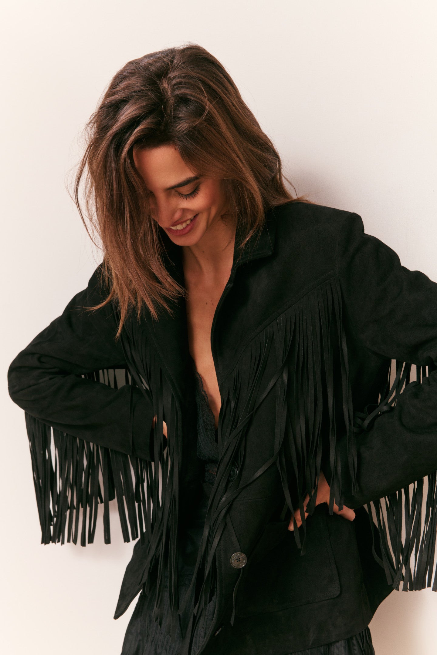 Our best-selling Geraline Jacket is back, this time in a chic, black suede. Adding a playful touch to your look, this fringe layer is designed from a soft, luxe lamb suede. The dramatic leather fringe details line the entire sleeves, the front and, the back, giving this piece gorgeous swaying movement throughout. This is the statement jacket you have to have.