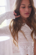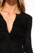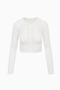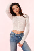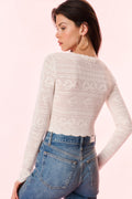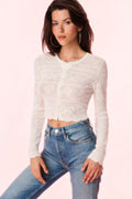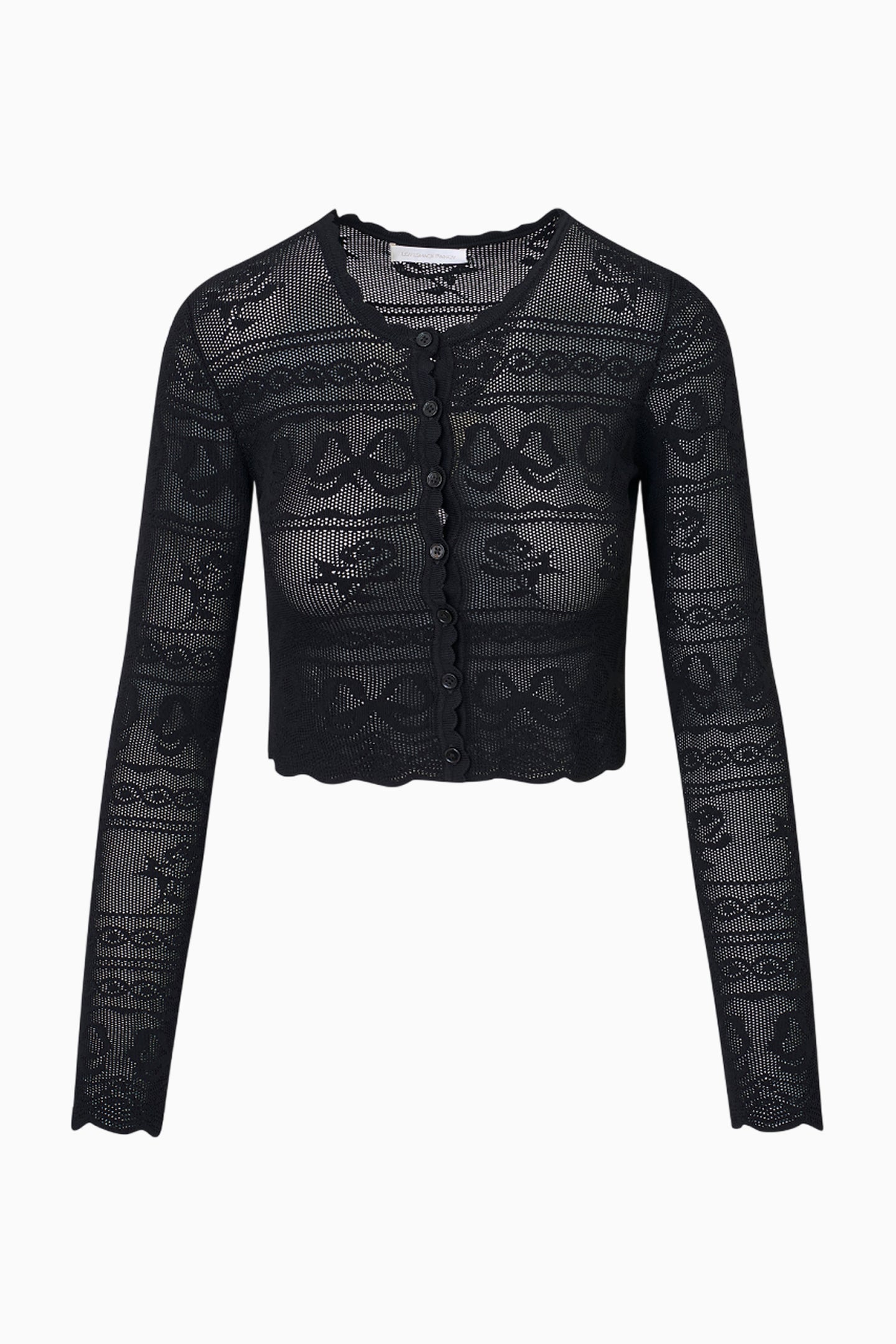 Add a chic layer to your look with the Gretta Cardigan. The charming knit arrives with nice stretch yarn featuring a stunning pointelle jacquard. Patterns of bows and florals are placed throughout the body. With a slim fit, the sweater features a ribbed scallop placket, placed bow and flower motifs, and our custom faux shell buttons.