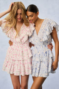 Our best-selling Gwen Dress returns as part of our Fragrance Capsule Collection, this time arriving in our best-selling perfume prints on an airy cotton with lace embroidery details. This short frock has a faux wrap top, which forms a deep v-neckline, shirred ruffles line the outer edges of the shoulder and bodice forming flutter sleeves. The skirt is constructed just like our signature Ruffle Mini – with an elastic waist and two shirred flounce tiers.