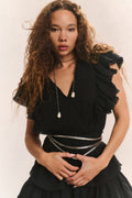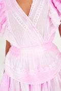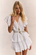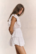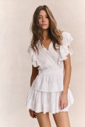 Our Gwen Dress is a sure favorite in cotton with lace embroidery details. This short frock has a faux wrap top, which forms a deep v neckline. Shirred ruffles line the outer edges of the shoulder and bodice, forming flutter sleeves. The skirt is constructed just like our signature Ruffle Mini—with an elastic waist and two flounced tiers.