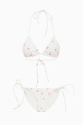 This season, our classic Harbor Bikini Set returns reimagined with a new cherry print. The sweet and sexy triangle top features a playful ruffle lining with interior bust seams. The print continues on the thin strings that tie comfortably around the neck and back. The bottom has a classic, revealing cut with string ties at each hip that make it adjustable.