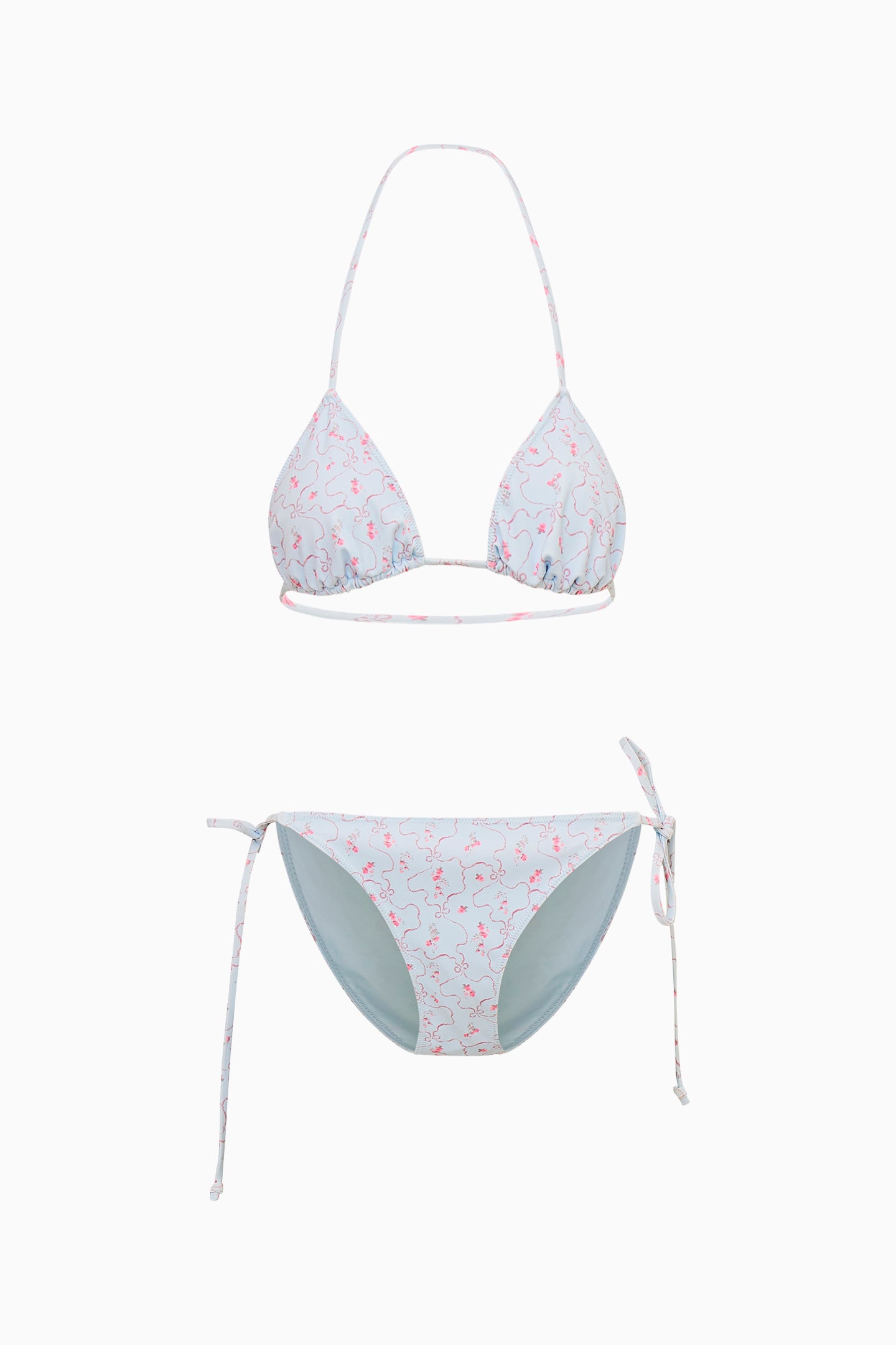 This season, our classic Harbor Bikini Set returns reimagined with a new pretty print. The sweet and sexy triangle top features a playful ruffle lining with interior bust seams. The print continues on the thin strings that tie comfortably around the neck and back. The bottom has a classic, revealing cut with string ties at each hip that make it adjustable.
