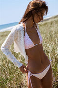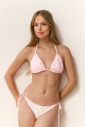 This season, our classic Harbor Bikini Set returns reimagined with a new pretty print. The sweet and sexy triangle top features a playful ruffle lining with interior bust seams. The print continues on the thin strings that tie comfortably around the neck and back. The bottom has a classic, revealing cut with string ties at each hip that make it adjustable.