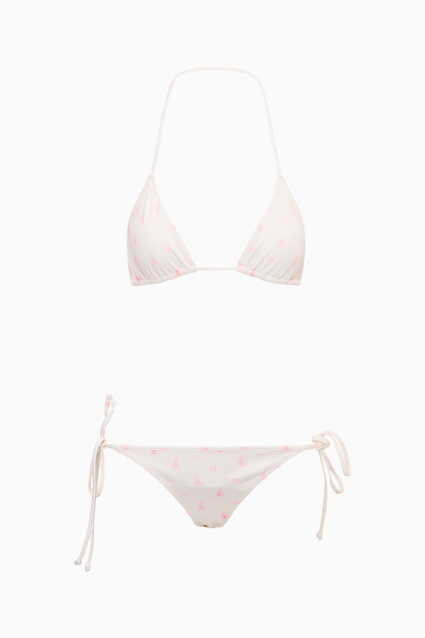 This season, our classic Harbor Bikini returns reimagined with a new playful ice cream print. The sweet and sexy triangle top features a playful ruffle lining with interior bust seams. The print continues on the thin strings that tie comfortably around the neck and back. The bottom has a classic, revealing cut with string ties at each hip that make it adjustable.
