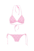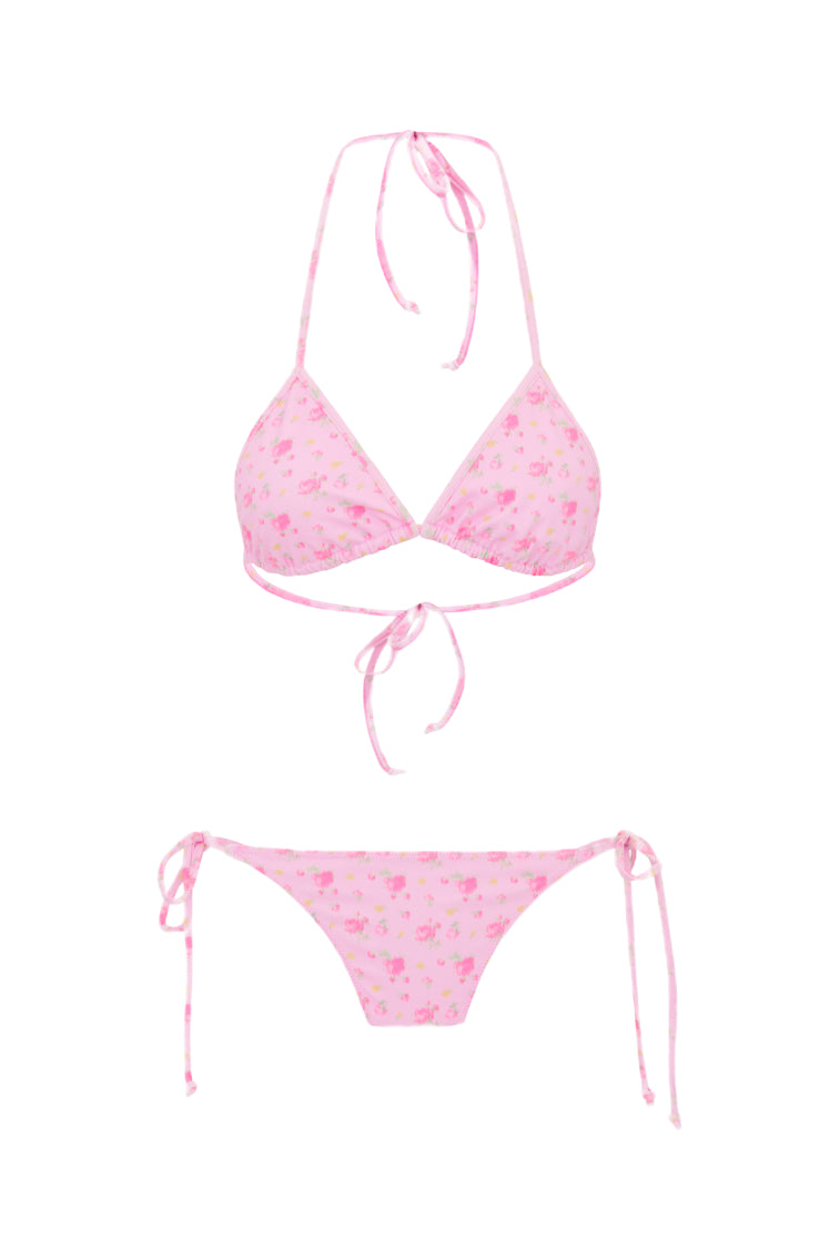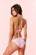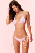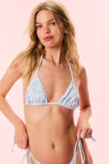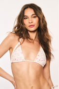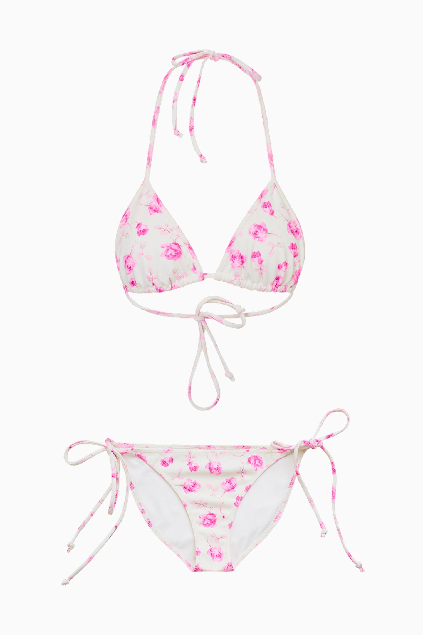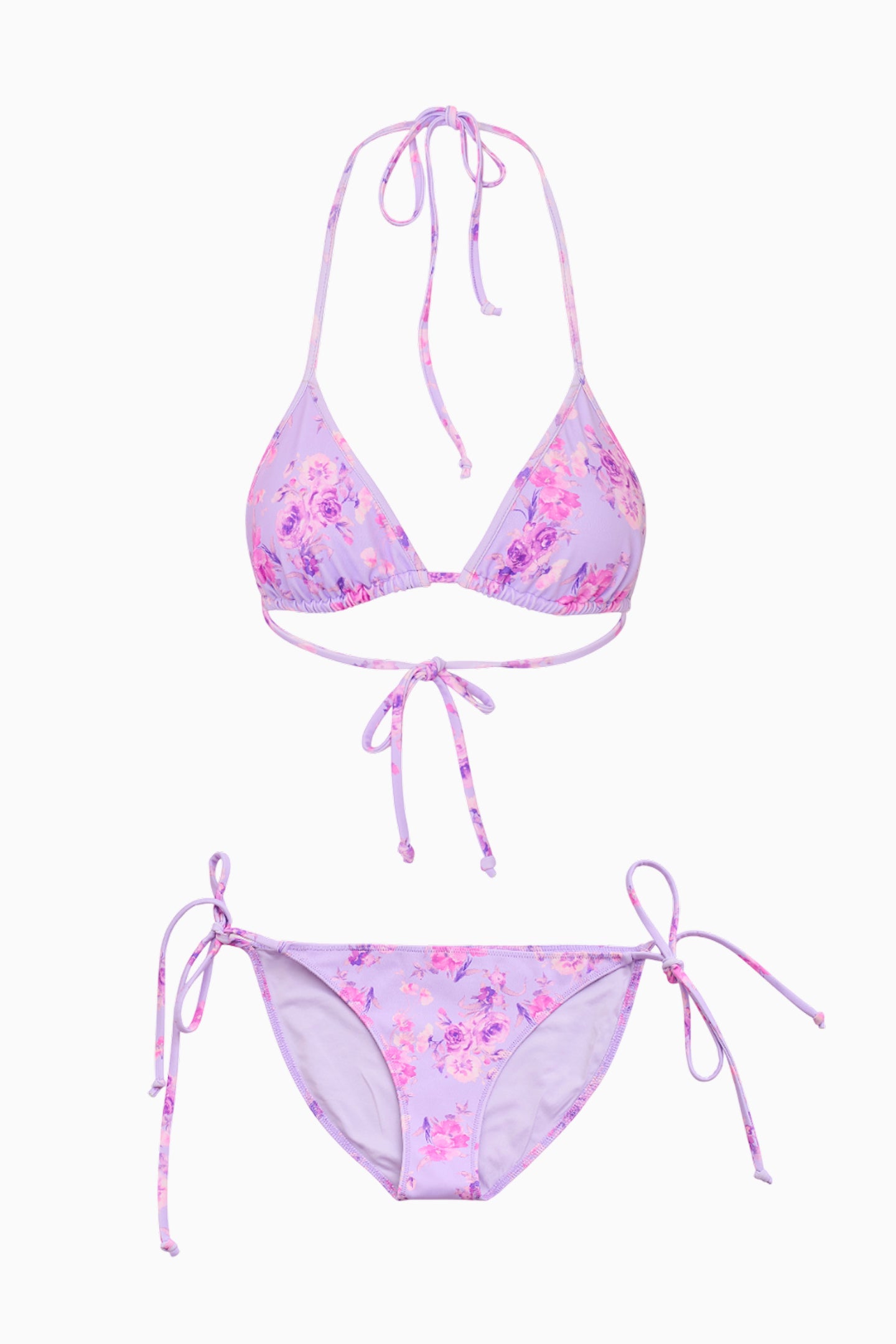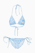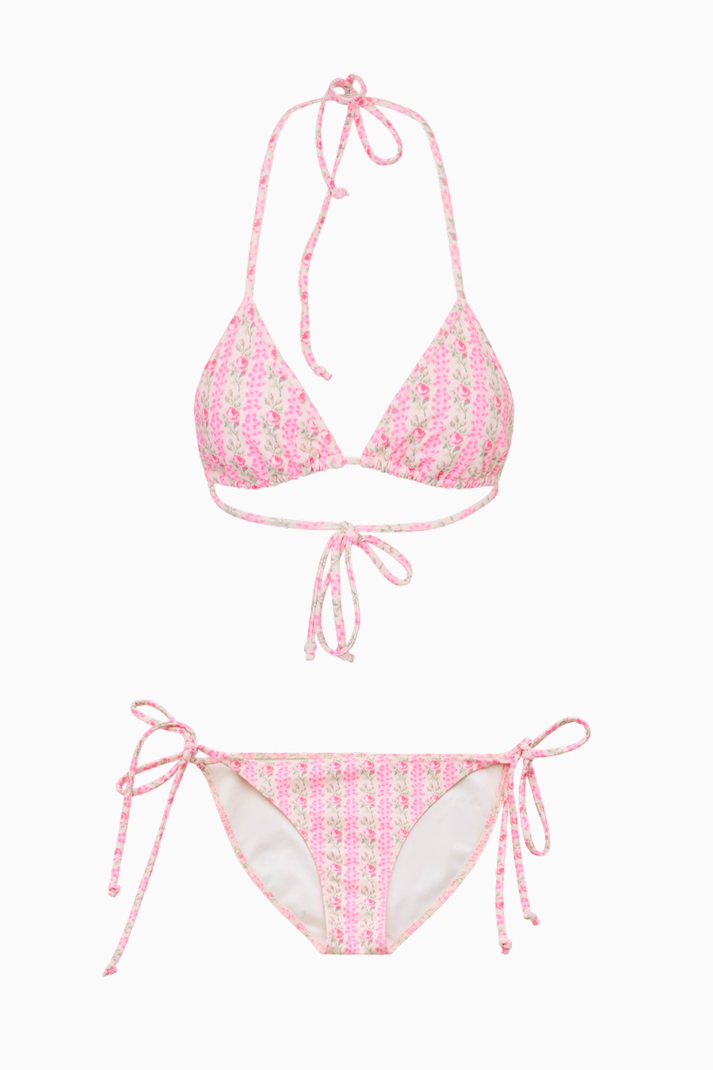 This season, our classic Harbor Bikini Set returns reimagined with a new pretty print. The sweet and sexy triangle top features a playful ruffle lining with interior bust seams. The print continues on the thin strings that tie comfortably around the neck and back. The bottom has a classic, revealing cut with string ties at each hip that make it adjustable.