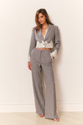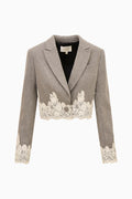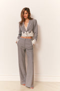 Add some edge to your look with our Icarus Jacket. This single-breasted, cropped blazer is part of our menswear-inspired pinstripe wolf suiting group. The elevated layer blends a solid gray shade and contrasts it with vintage-inspired laces on the cuffs and at the hem. This piece features a structured shoulder above the long slim sleeves, a collared lapel, and self-covered buttons. Pair with our Oriaith Pants or our Teddi Dress to complete the look.