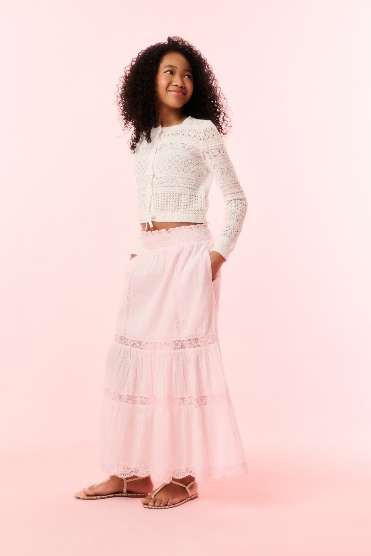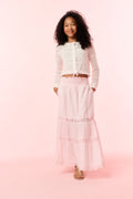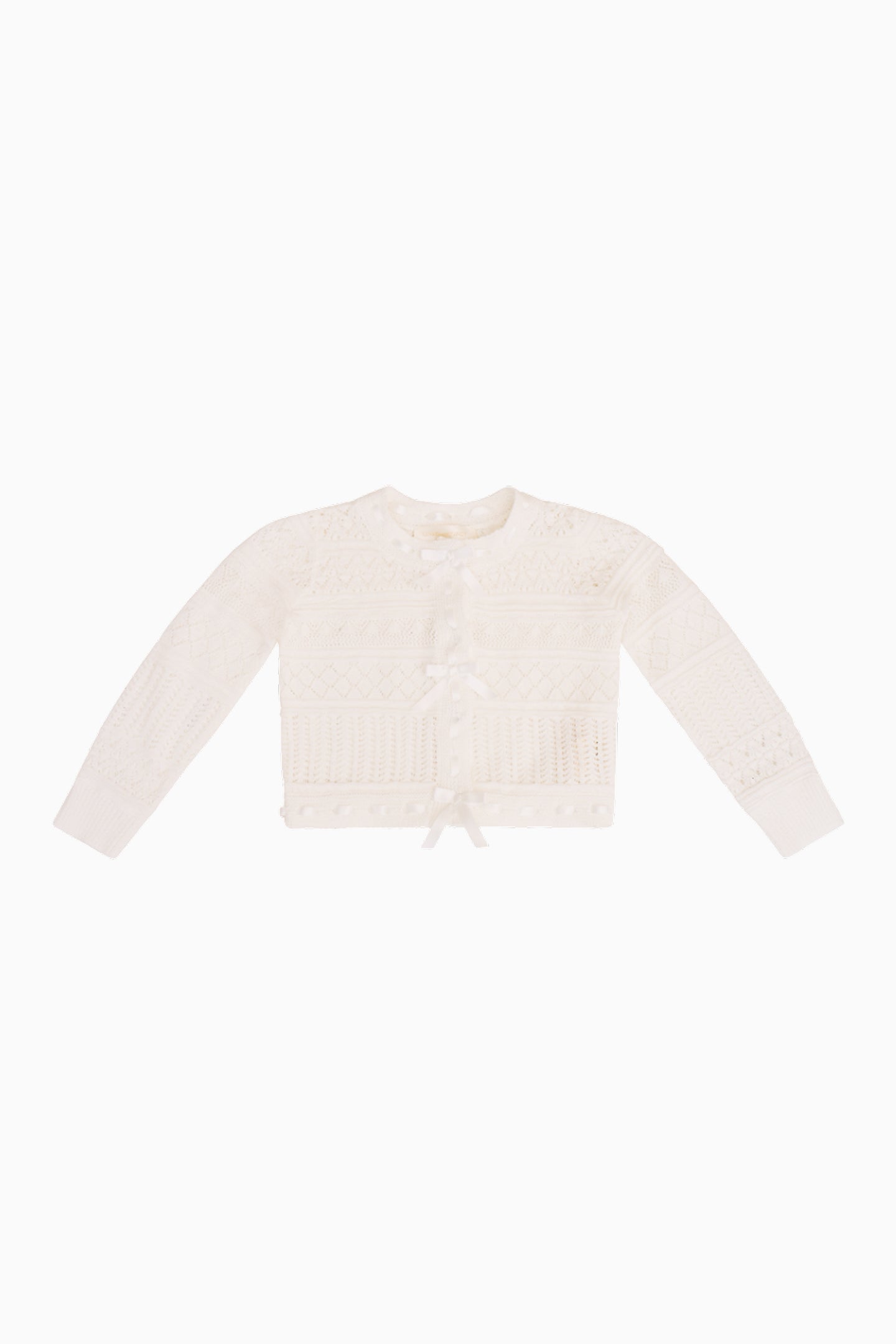 Stay cozy and cute in the Iriselle Sweater. This knit features intricate woven techniques and embroideries all over giving it a unique look and feel. The piece is finished with ribbon woven throughout for a feminine touch.