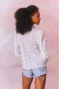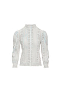 Our best-selling Jacque Top is back for the summer, this time in an airy, organic cotton fabric. The Victorian-inspired top features a turtleneck and long blouson sleeves with delicate custom floral laces and pintucking all over. The top includes buttons down center front for a chic finish.