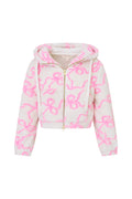 Our minis keep it warm and cute in the Jacquel Bomber. This must-have fleece outerwear features our signature winding bow print all over, a hood, drawcords, center front zipper, and pockets.