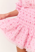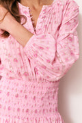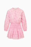 Pretty in pink for the fall season with the Janis Dress. This charming frock debuts with a striped cotton dobby fabric giving this piece an intricate texture featuring an ikat tossed floral print. With a Victorian-inspired button down cotton mini arrives with an easy top with buttons descending down center front to the waist, 3/4 length sleeves, and elastication for easy pull on. The waist has smocking that then falls to an airy skirt.
