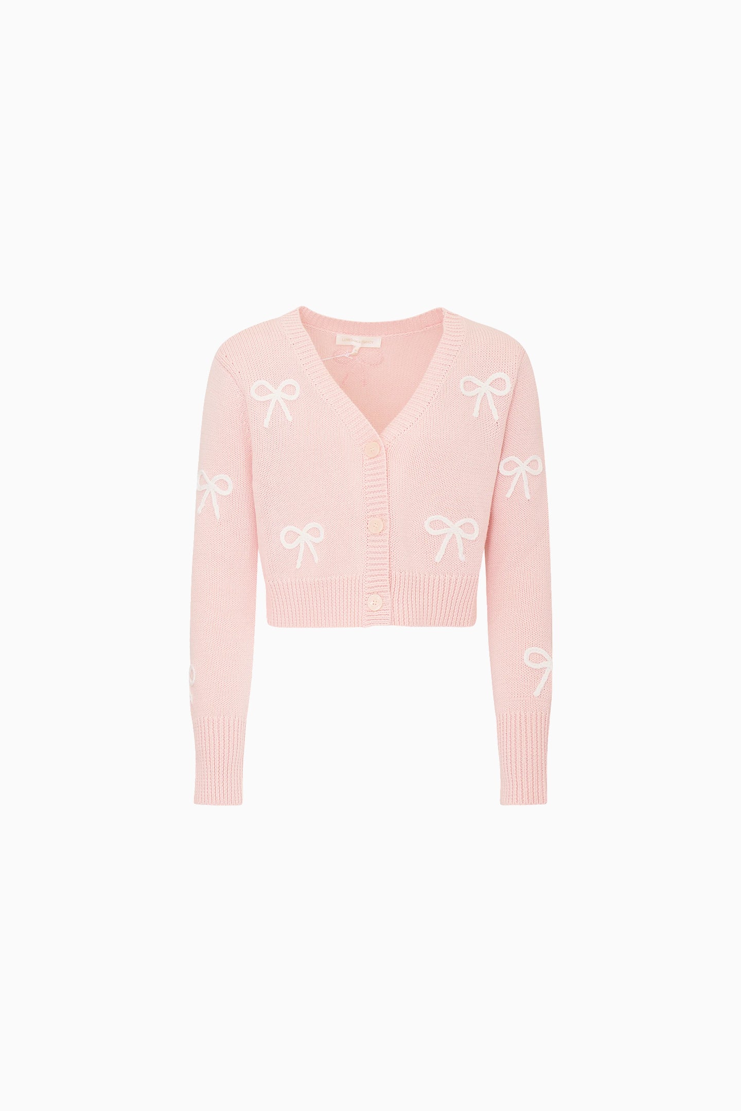 The Jayne Cardigan is rendered in a cropped knit silhouette with a soft, cozy structure. A V-neckline frames the front, where center-front round buttons provide a polished finish. Long sleeves and ribbing at the hem and cuffs add dimension, while a playful bow print pattern enhances its charm.