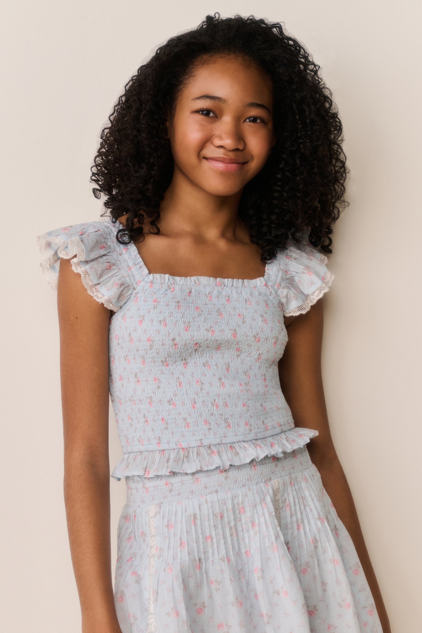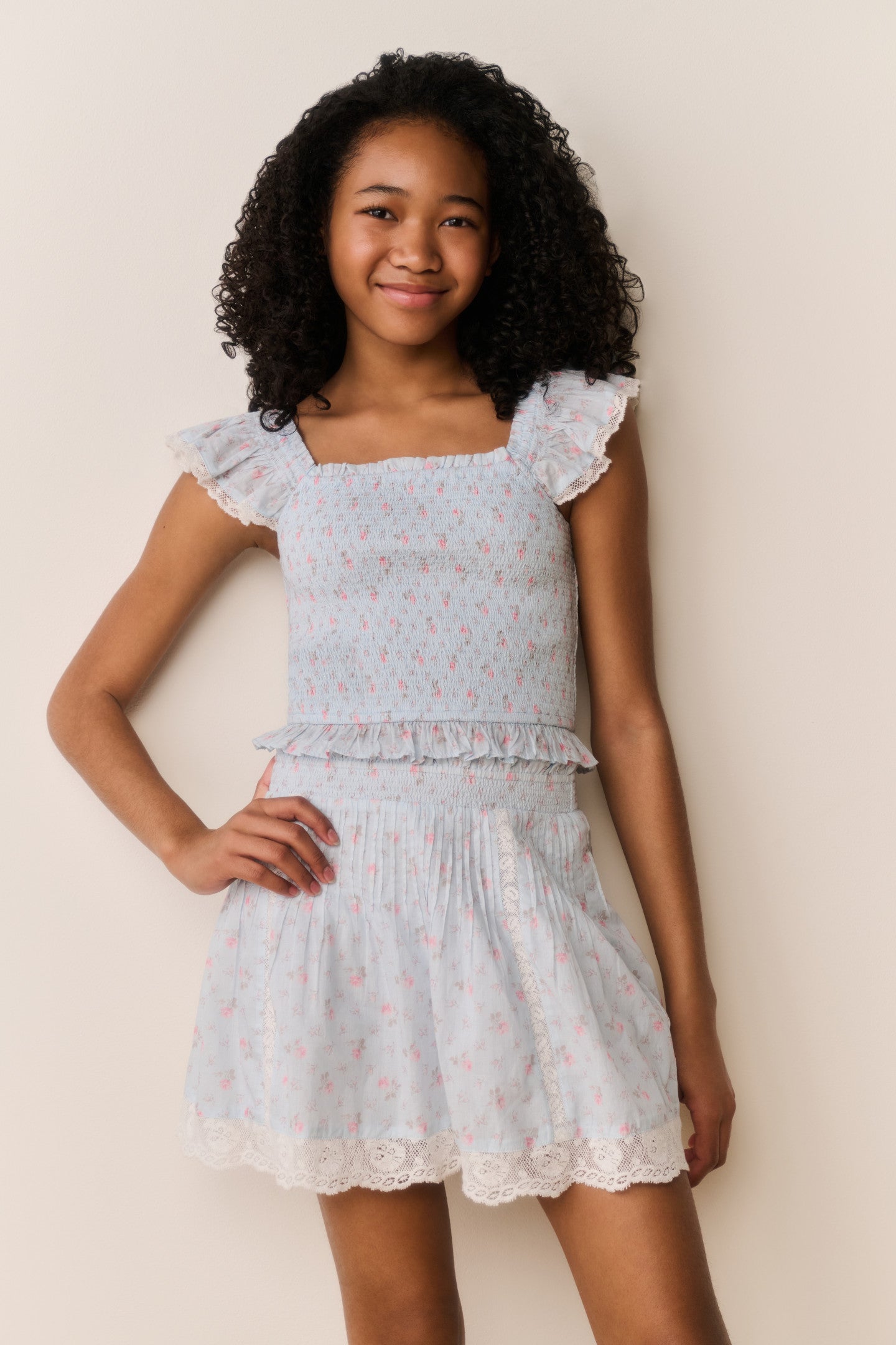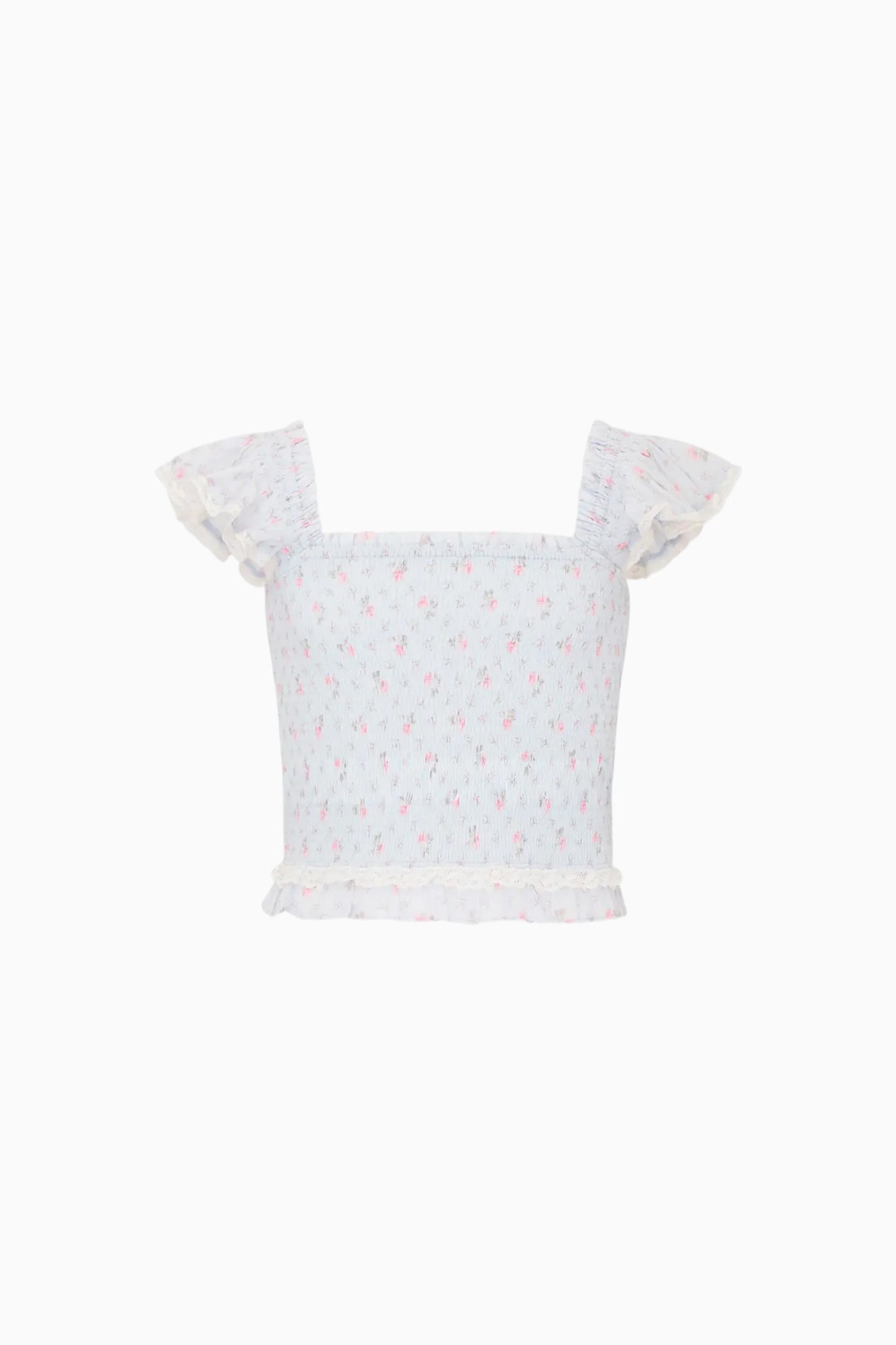 The Jeanna Blouse features a square neckline and short flutter sleeves in a soft floral print. Lace insets at the waist add subtle structure to the cropped silhouette, while frill trim along the edges creates a delicate finish.