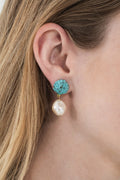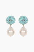 An unexpected finishing touch, the Nori Earrings find semi-precious turquoise formed by hand into scallop shells. Made by hand in New York, the stones are juxtaposed by a baroque-shaped crystal pearl drop. We love turquoise for the natural variations found in each stone, which means no two pairs are entirely alike.