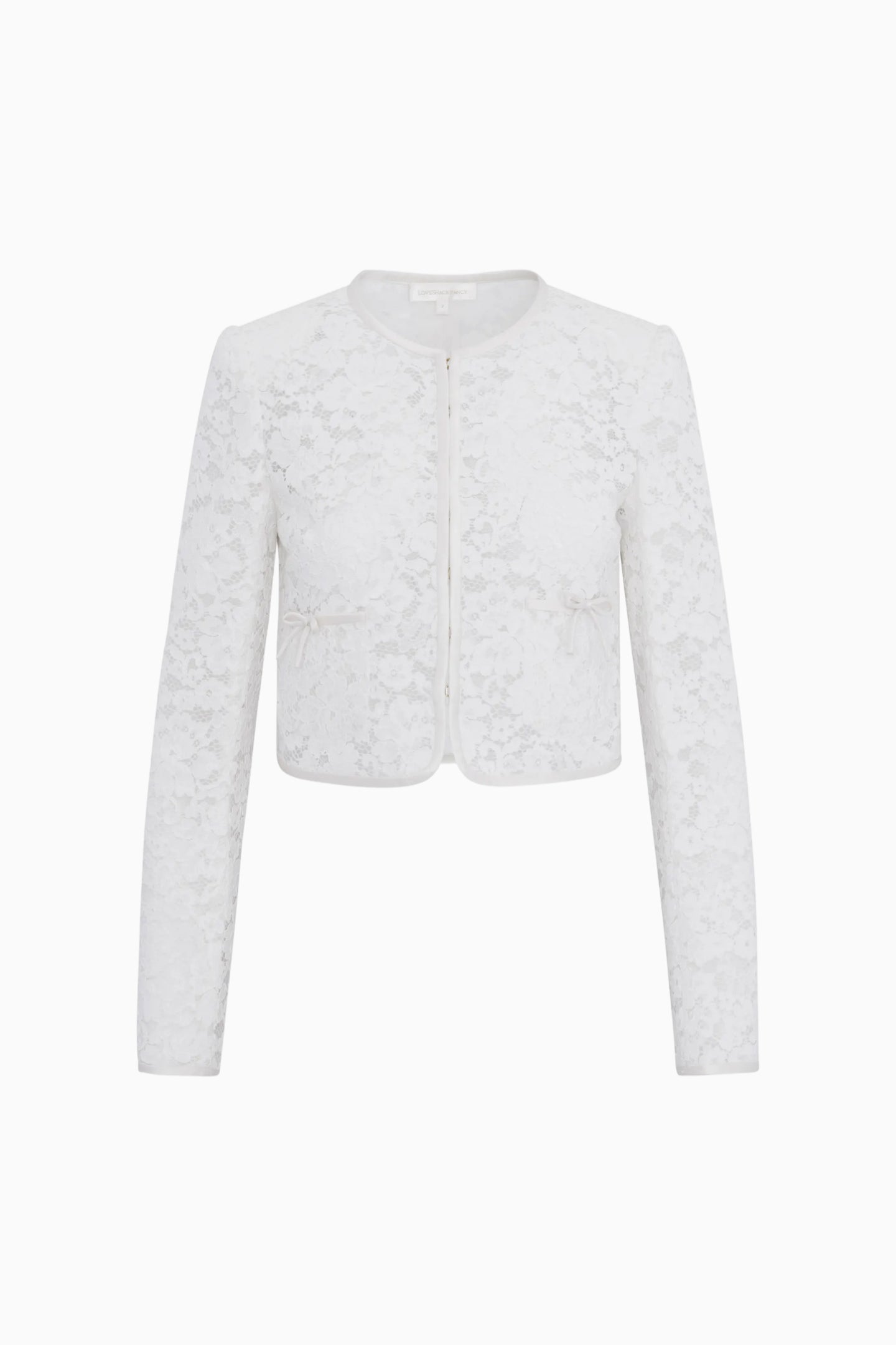 Shaped in a cropped silhouette, the Junetta Jacket offers a polished, evening-ready structure. The crew neckline and long sleeves are framed with floral-patterned lace trim and convenient pockets are adorned with delicate bow embellishments. It’s the perfect layer to add a touch of romance to any ensemble.