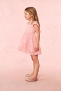 Our girls are springtime ready in the Kappy Dress. Extra charming this dress debuts with the most stunning arrangement of floral eyelet details on a sheer, crips fabric. The hem features scallop details for a lovely finish. This piece comes fully lined and includes pockets.