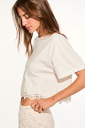 Living in the Karolin Tee. This easy cotton tee arrives with an eyelet trim at the hem, short sleeves, self double neck bindings at the sleeves, and a nice, oversized fit.