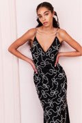 The Kaylen Dress swoons with a delicate beaded mesh fabric with gorgeous crystal bow embroidery studded with rhinestones all over. The soft fabric is chic yet comfortable with a figure-hugging silhouette and a lining on the inside. The straps are lined with rhinestones before descending to a sexy v-neckline.