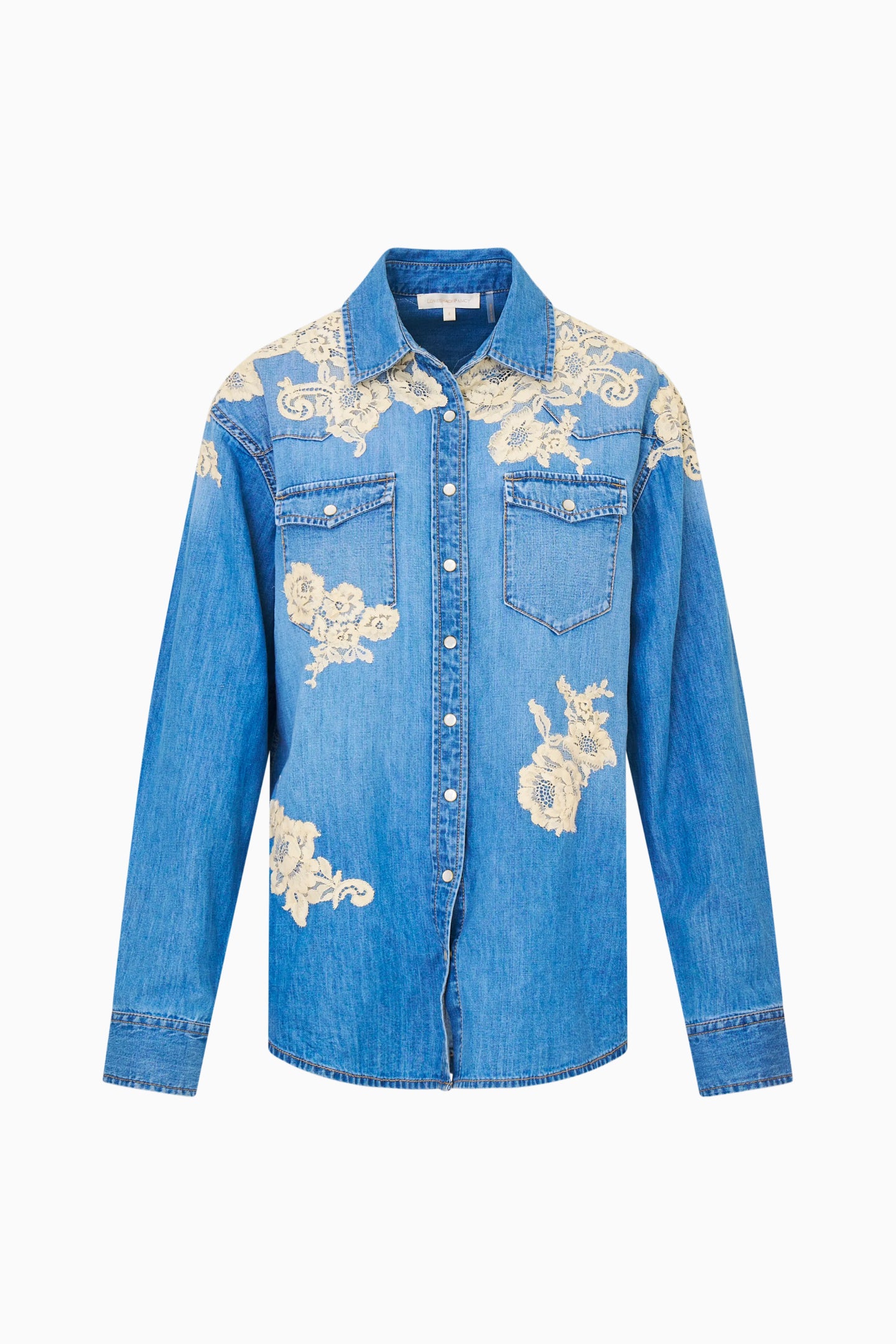 Our Kelith Shirt reimagines denim with a soft, romantic twist, featuring intricate floral embroidery and airy lace appliqués. A collar and front pockets add a structured touch to the relaxed silhouette. It’s a refined yet casual staple with a touch of charm.