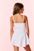 Our girls are sporty and cute in the Kishori Dress. This pretty piece is designed from our lightweight, breathable active fabric and features built-in shorts, removable bust cups, side pockets, adjustable straps, side slits, and lace trim at the neckline, armholes, and hem.