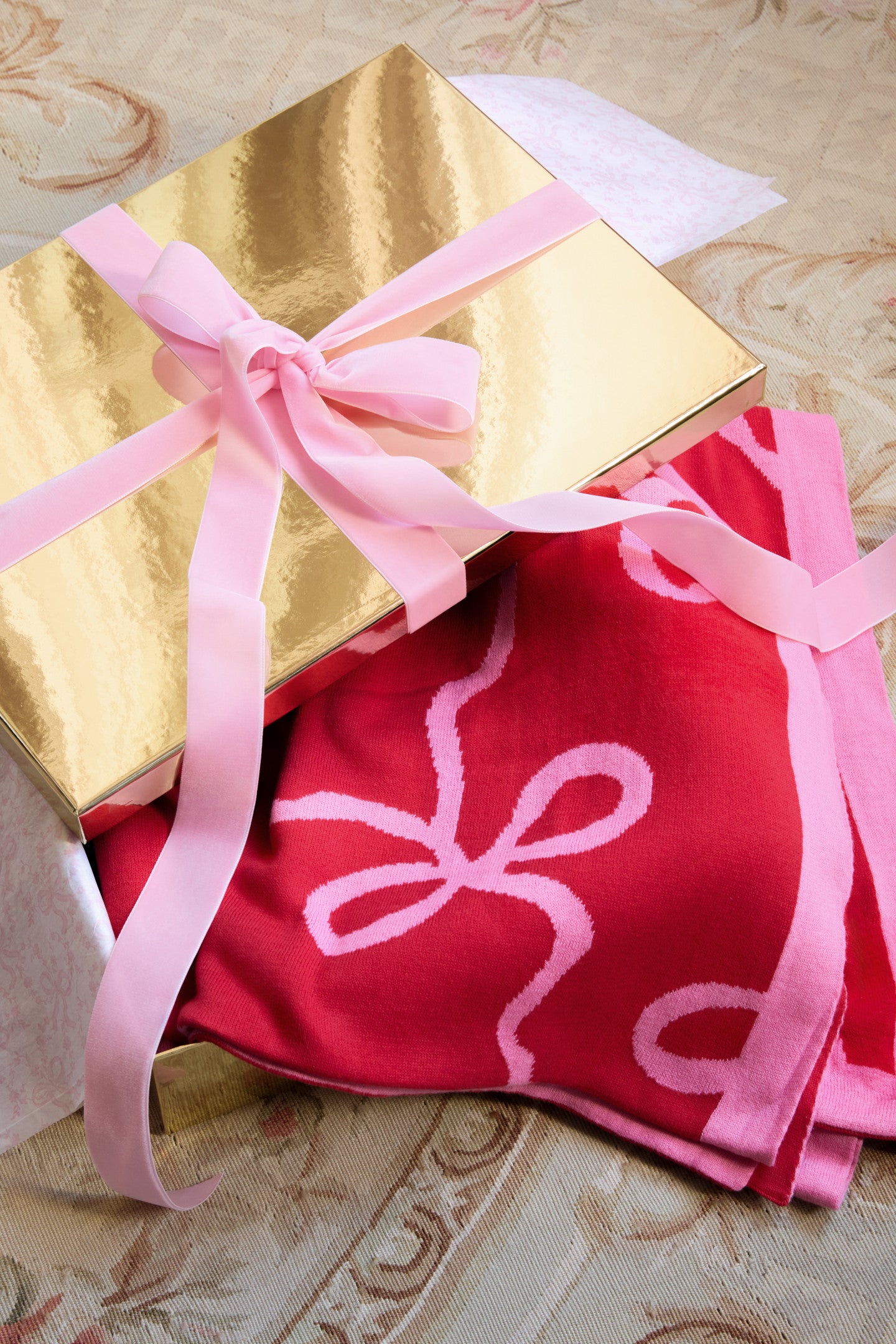 Add a festive pop of color and cozy charm to your home with our Holiday Jacquard Knit Throw. In a playful mix of red and pink, this blanket features LoveShackFancy’s signature winding bow pattern woven throughout, making it as much a statement piece as it is a cozy companion. Ideal for curling up by the fire, layering over chairs, or gifting to someone special.