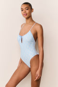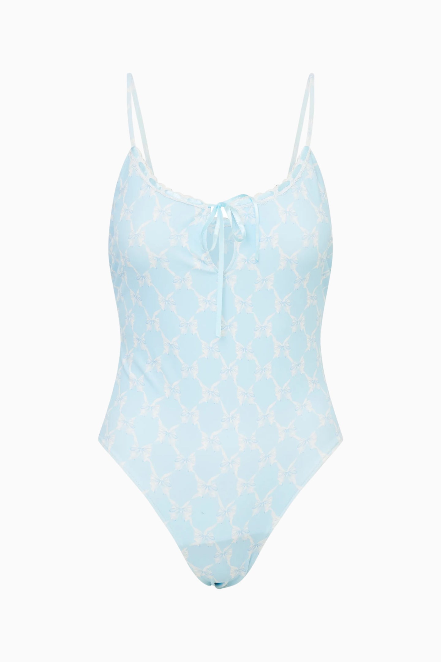 A sweet, feminine one-piece with signature ribbon-and-bow detailing. The front features a fixed center bow with delicate ribbon weaving along the top edge. Straps crisscross and tie at the back for an adjustable, romantic finish, while the slightly higher-cut leg gives a flattering, elongated shape.
