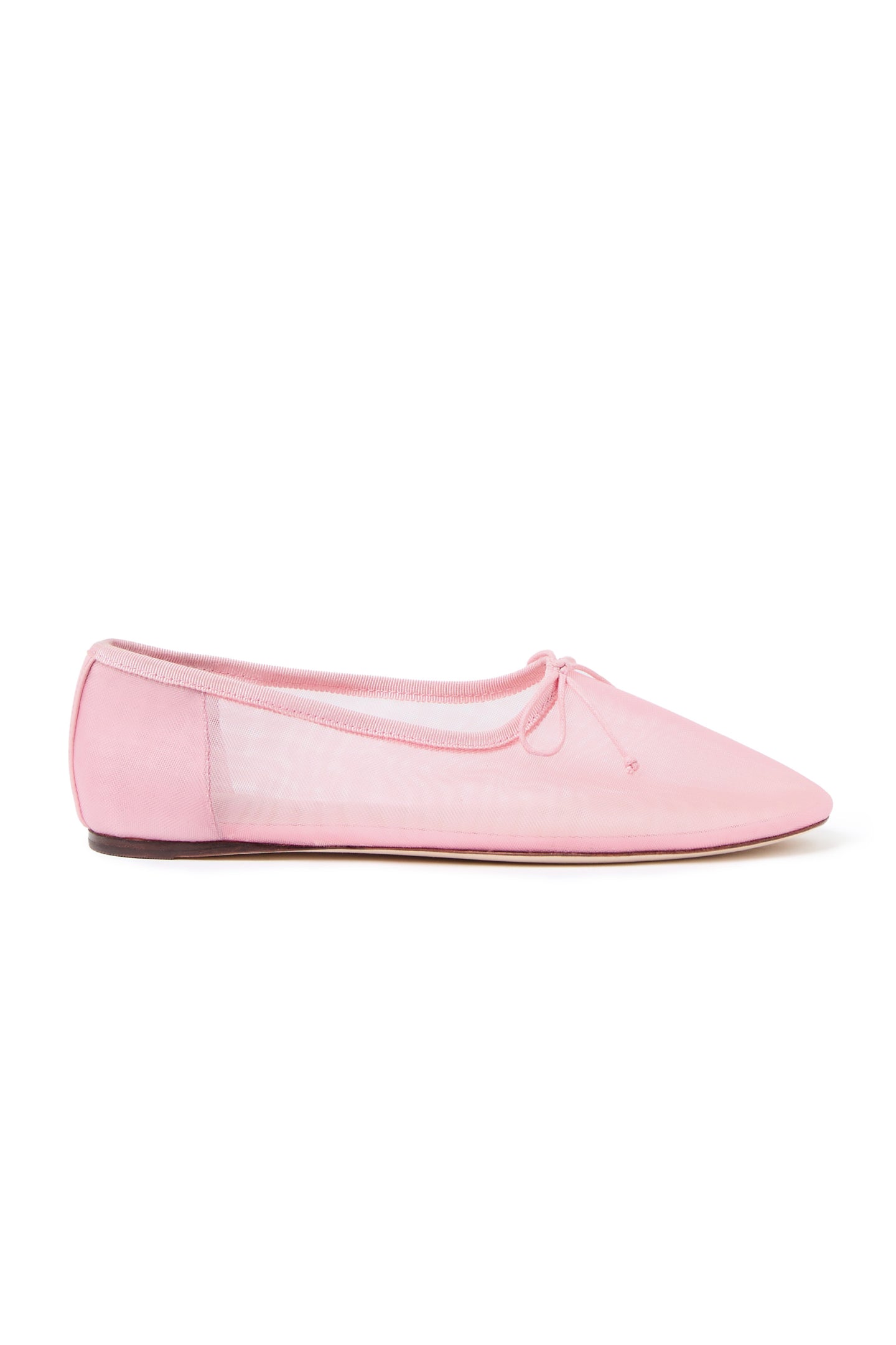 Soft ballet flat in bright ballet pink mesh with bow detail. Features a padded leather footbed with gold stamped logo and an almond toe.