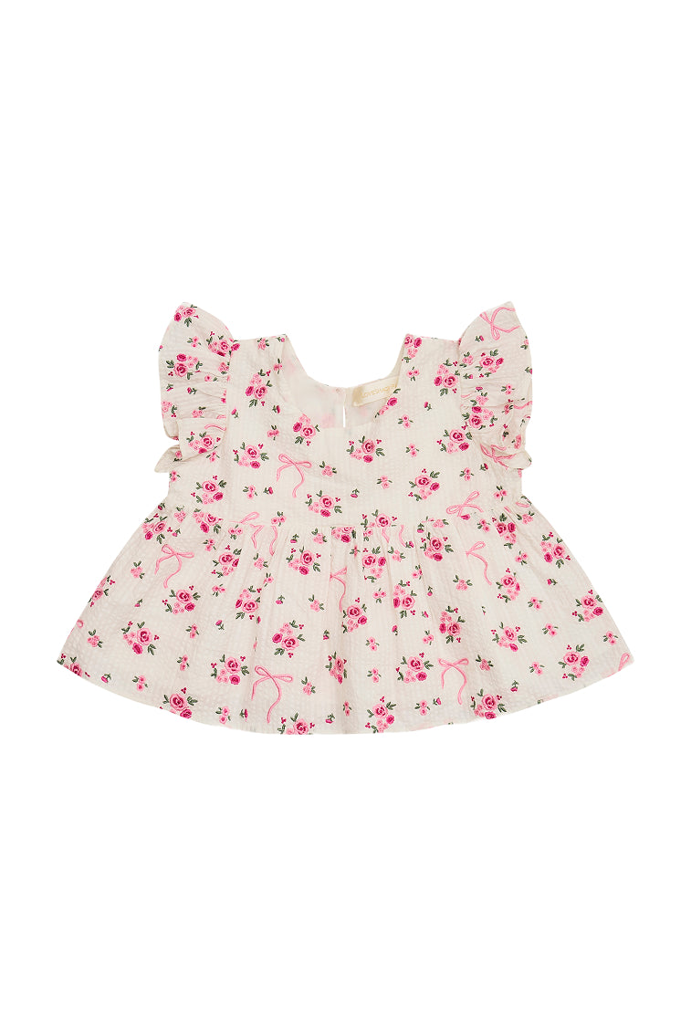 Our littles are springtime ready in the Landri Top. This pretty piece stuns with an airy fabric and sweet, short ruffle flutter sleeves. Pair with the Nalina Bloomer for the full set.