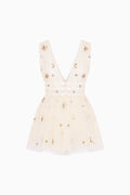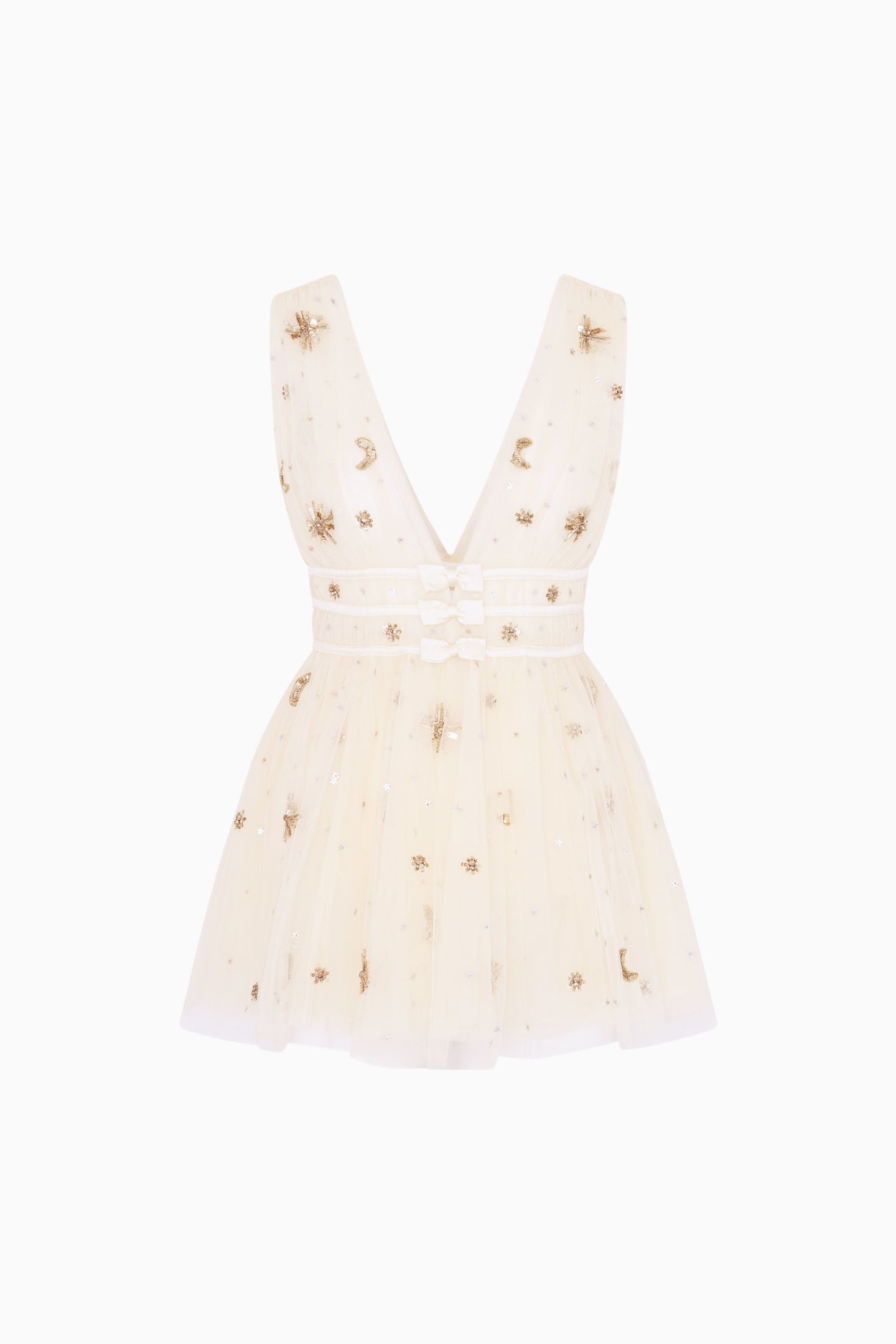 The Lawton Dress is a ballerina-inspired holiday fantasy. Crafted from a metallic tulle in cream with gold dotted accents, it shimmers with delicate, festive sparkle. This mini, sleeveless dress features a deep V-neckline, nipped waist, and three rows of satin trim, with hand-applied bows at the front waist that release into a flirty, layered skirt. Fully lined and hand-beaded, it’s a whimsical yet refined piece.
