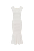 Introducing the Leigh Dress. This stunning bodycon dress is designed from a stretch pointelle knit fabric with intricate, tiny scallop texture woven throughout the pointelles creating a beautiful texture. The dress begins with a square neckline that flows to a slim fitted dress and skirt that flares at the hem for a feminine finish.