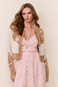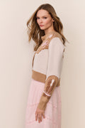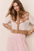A sweet cropped cardigan with a bow Fair Isle motif with stars and florals, classic crew neckline, vintage-style buttons, and playful trompe l’oeil pockets. Finished with ribbed trim cuffs and hem and long sleeves for a cozy, feminine layer.